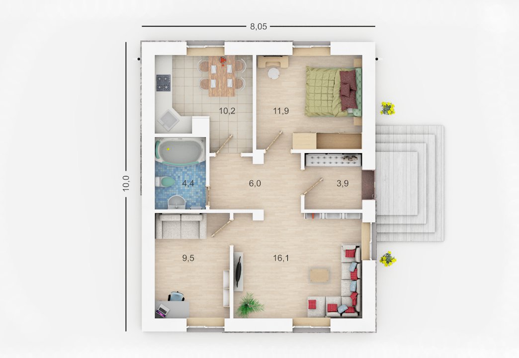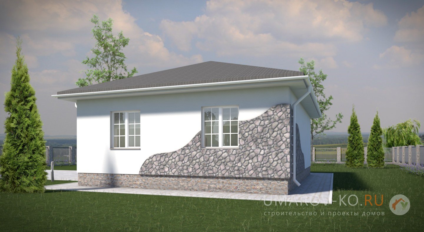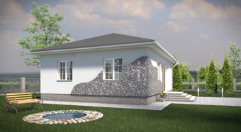 «Корка-2 без облицовки» - выгодный в строительстве и эксплуатации маленький одноэтажный дом оснащен всем необходимым для круглогодичного проживания. Комфорт в использовании помещений на одном уровне исключает необходимость перехода с этажа на этаж. Отсутствие несущих стен даёт возможность свободно менять планировку.