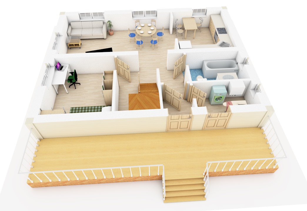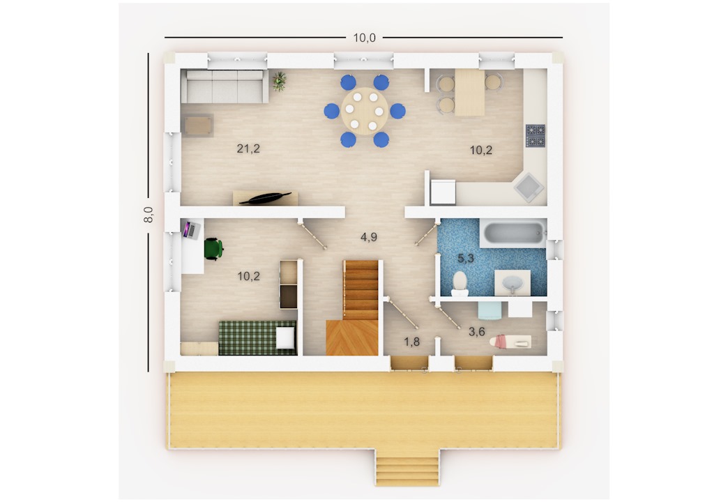 | 1 этаж | тамбур, тех.помещение (сауна), ванная, коридор, комната, кухня, столовая-гостиная | |