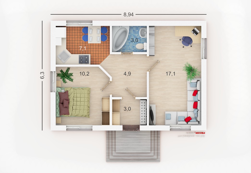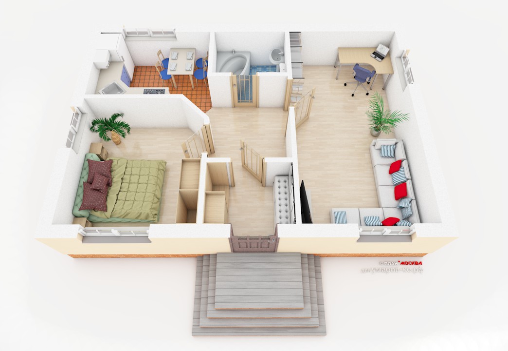 Для этого проекта можно взять планировку от «Мини», тогда получится объединённое пространство гостиной-кухни и две отдельных спальни или спальня и кабинет.Состав помещений