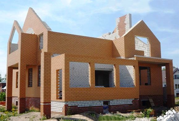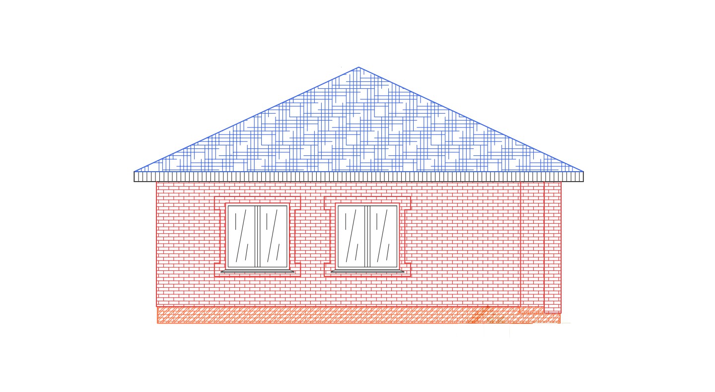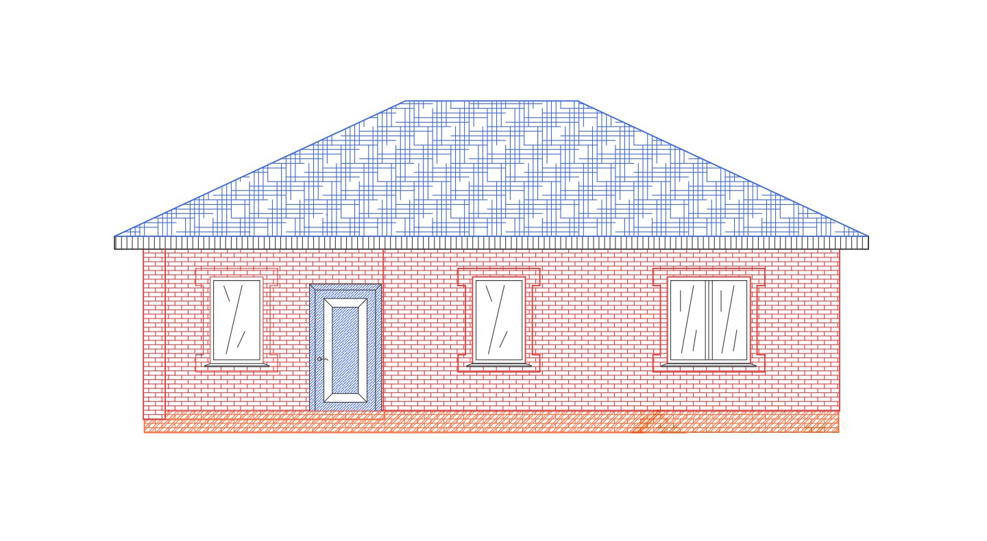 | Фасад | стены дома облицованы одинарным керамическим красным кирпичом. Цоколь выполнен из рядового красного кирпича под штукатурку или отделку камнем | |