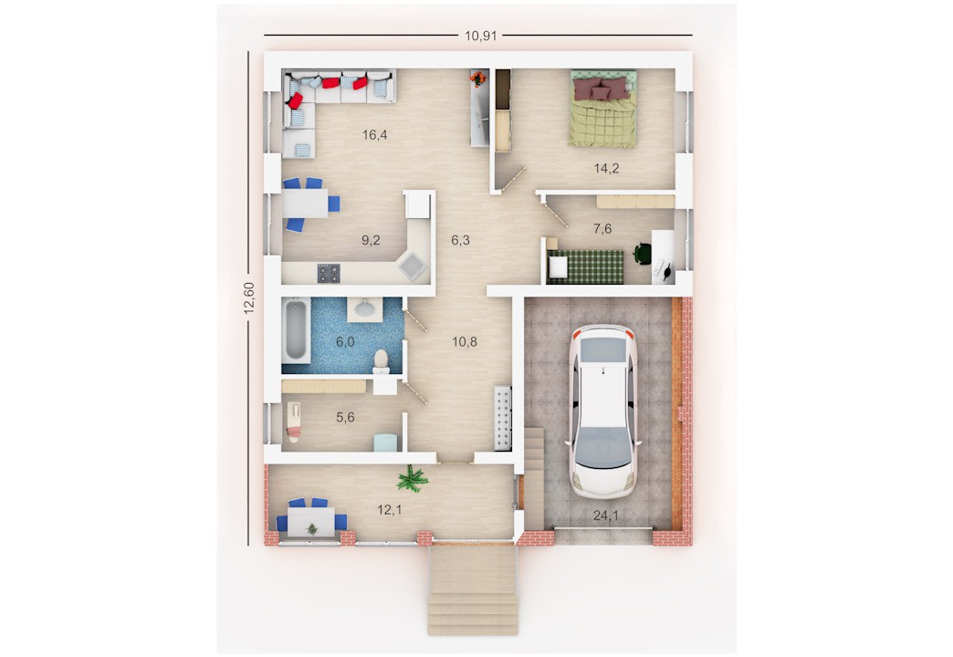 «Изаура» - одноэтажный дом имеет всё необходимое для проживания или отдыха небольшой семьи. Котельную при желании можно переоборудовать в сауну. Это один из самых маленьких проектов со встроенным гаражом.