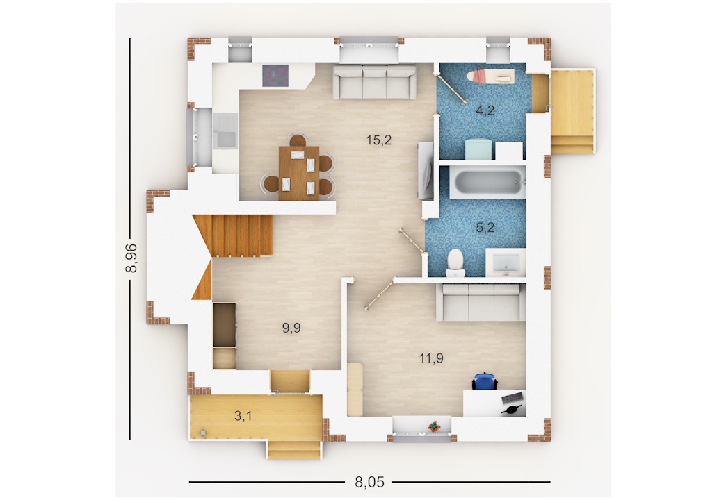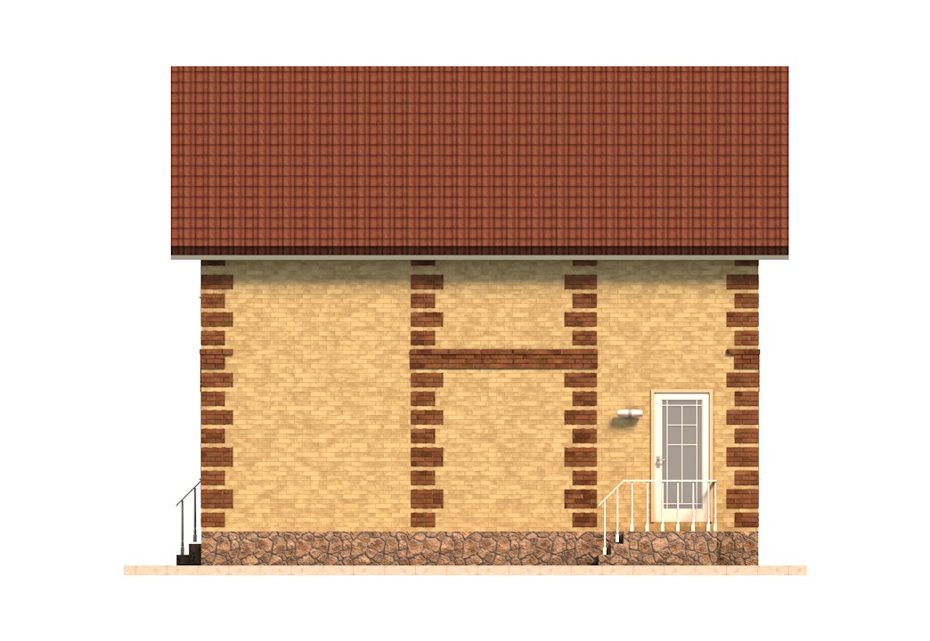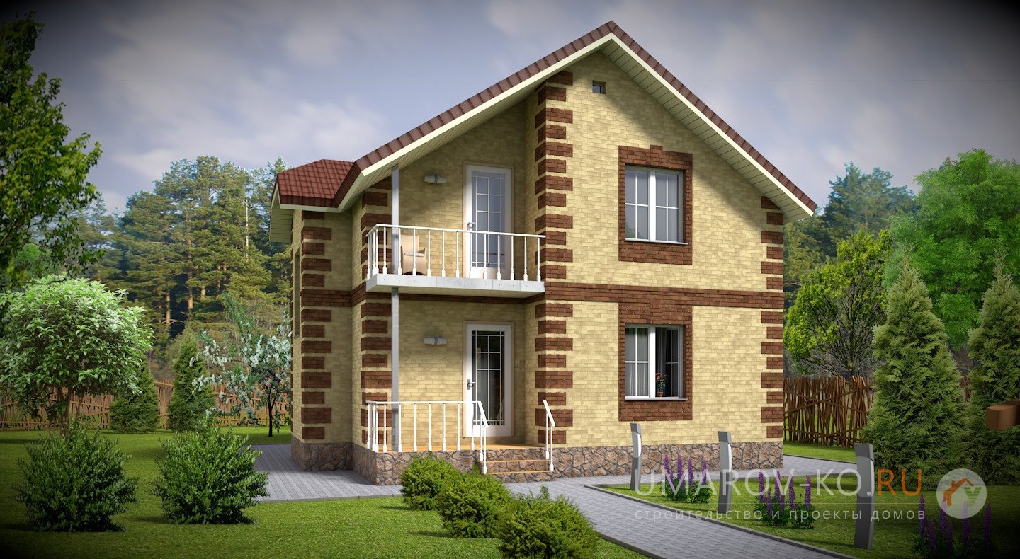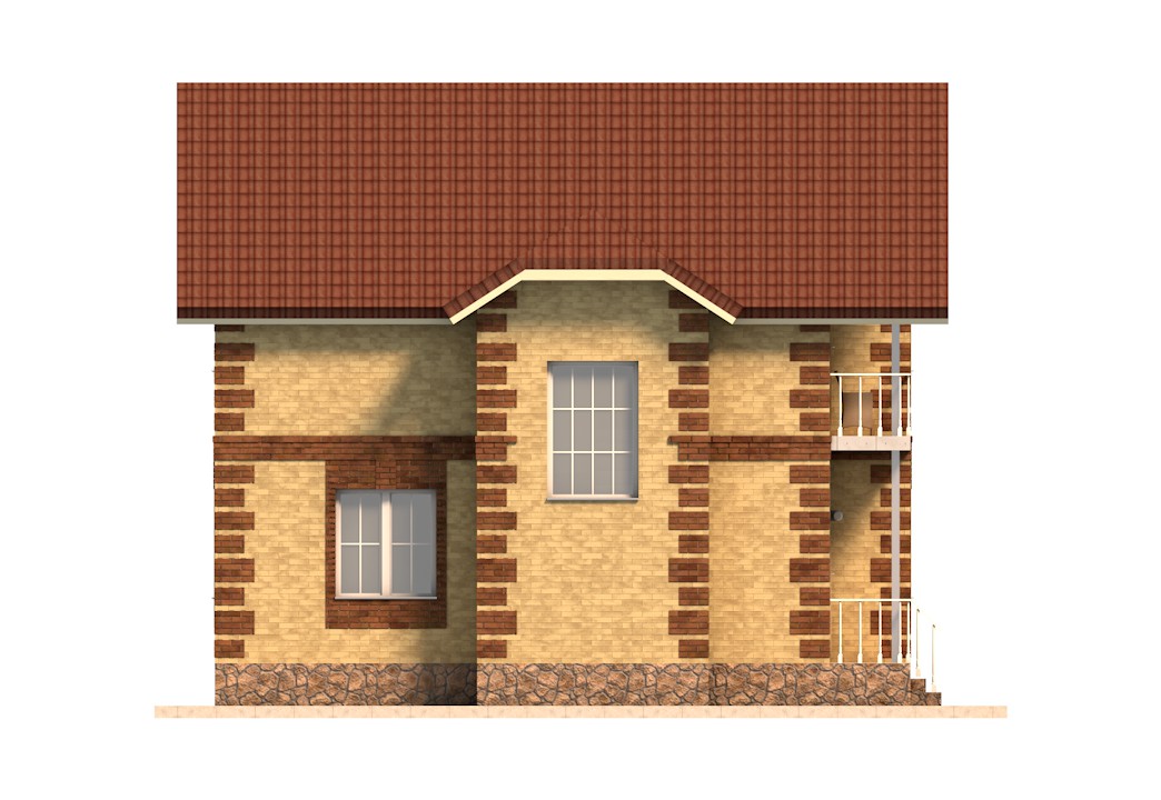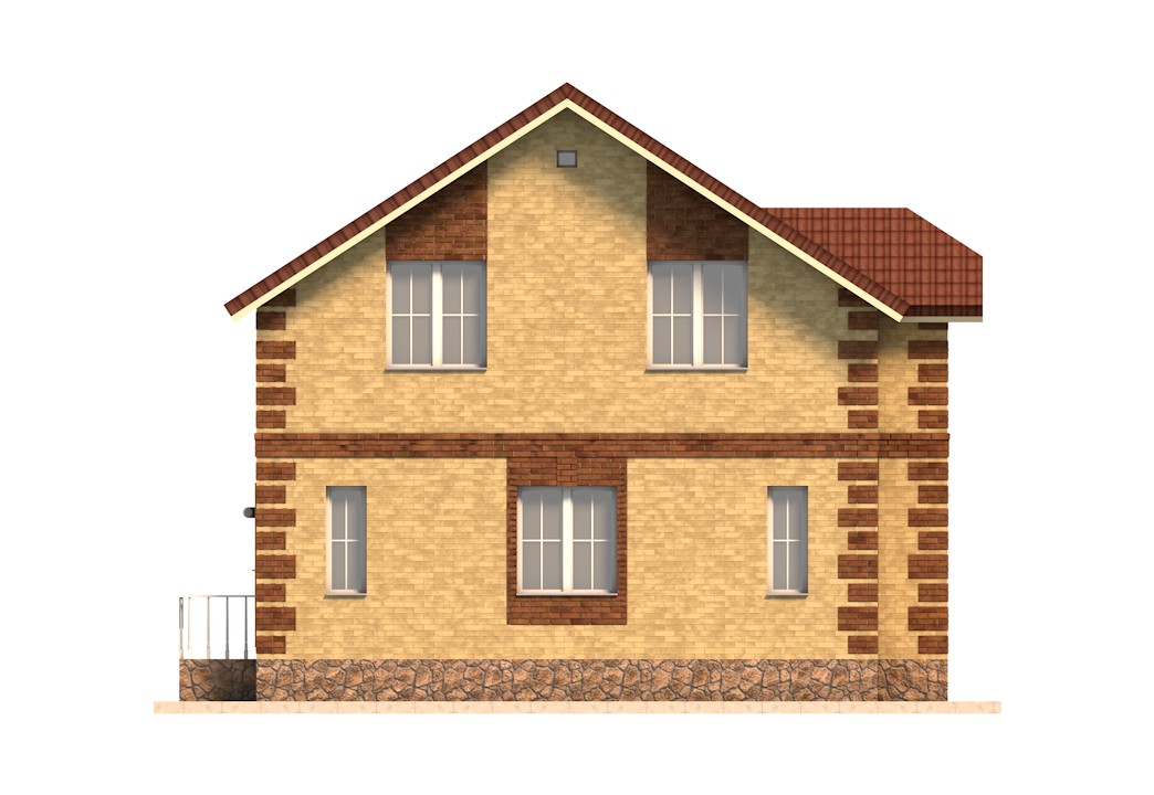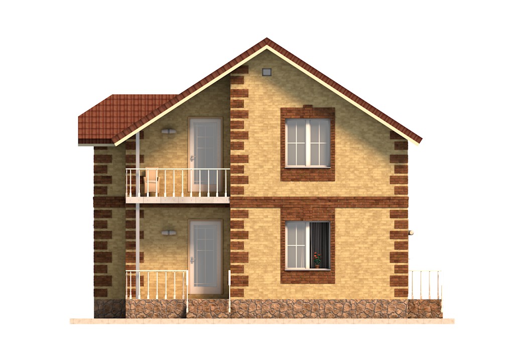 | Фасады | стены дома отделаны облицовочным одинарным кирпичом цвета "Солома". Обрамления углов, оконных и дверных проемов выполнены из облицовочного одинарного кирпича цвета "Шоколад". Цоколь выполнен из красного рядового кирпича под отделку камнем. Ограждение балкона - деревянное |