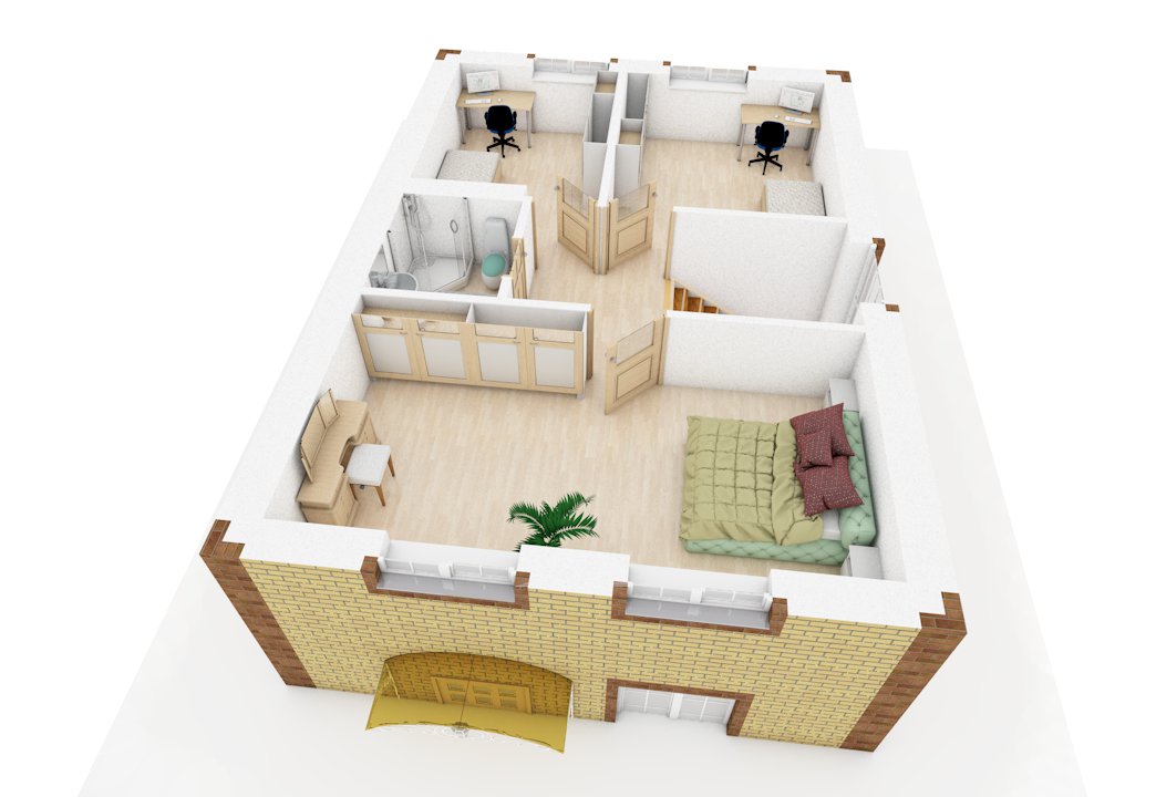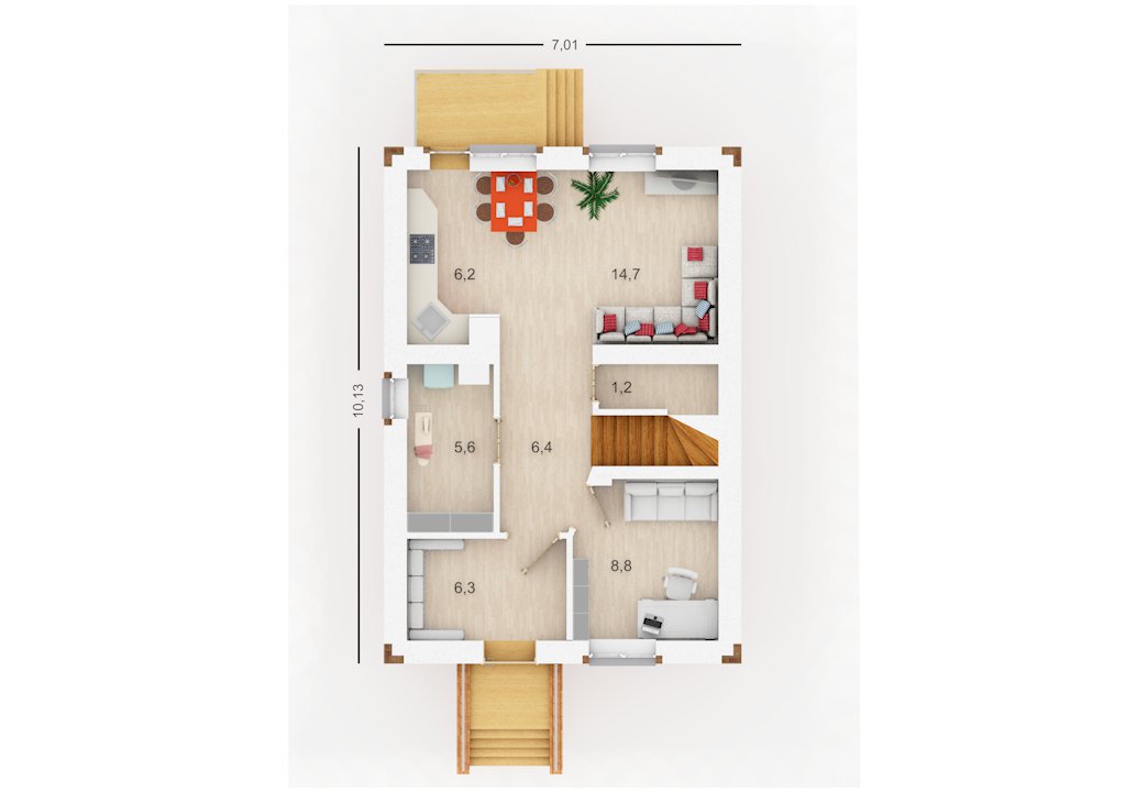 | 1 этаж | прихожая, холл, котельная (хозяйственное помещение или сауна с санузлом), кабинет, кухня, гостиная |