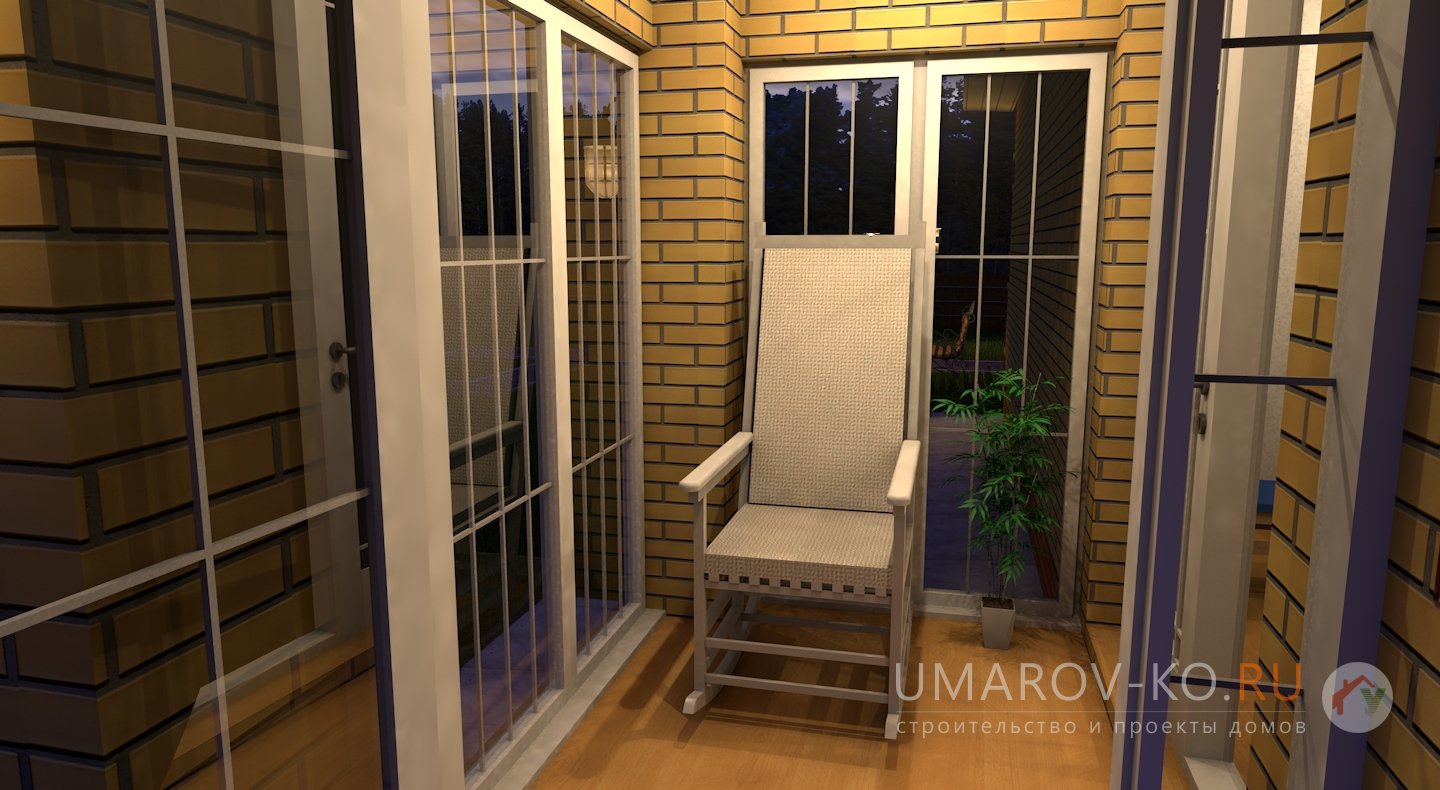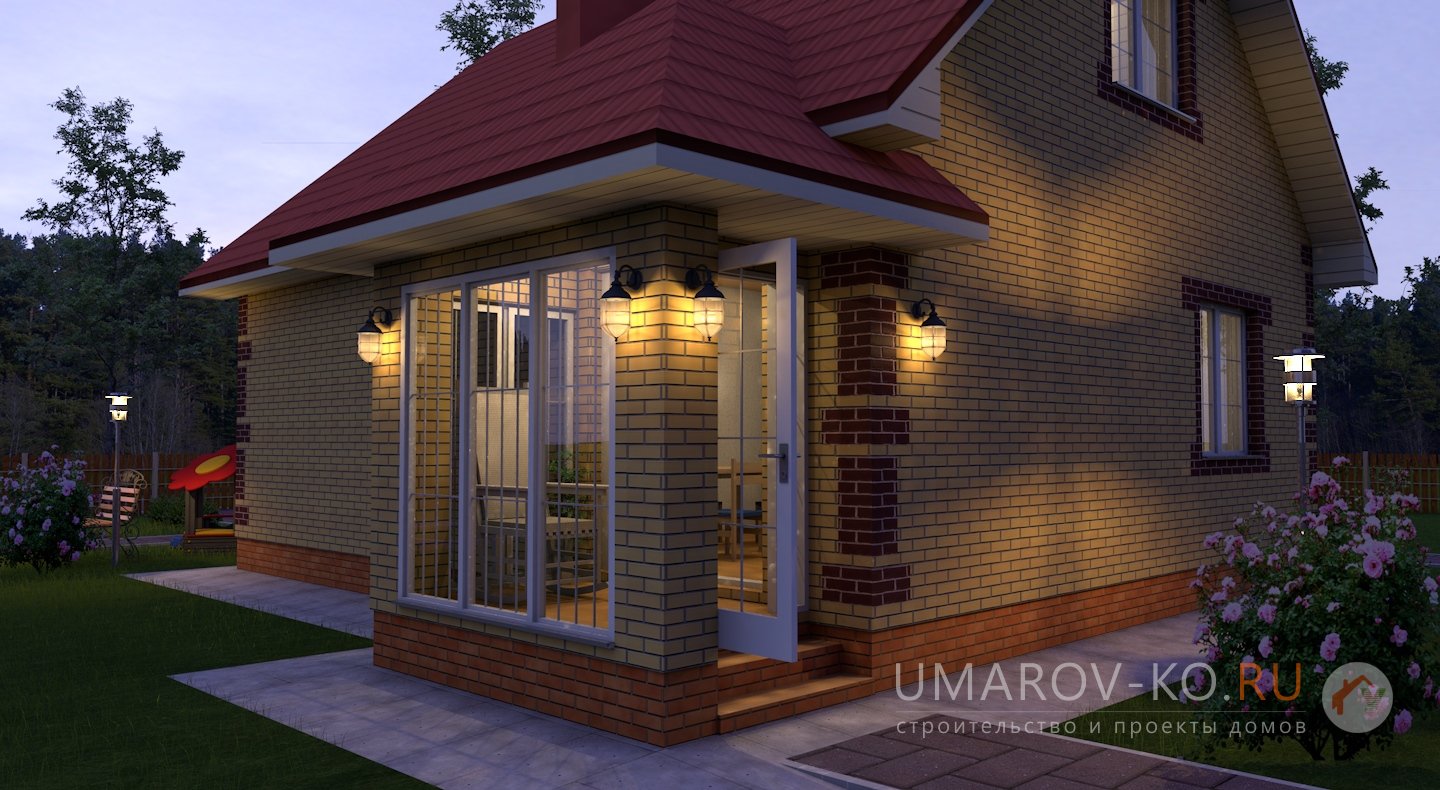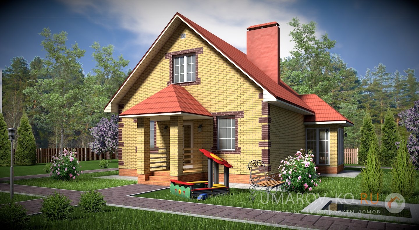 | Фасад | стены дома облицованы одинарным керамическим кирпичом желтого цвета (солома). Обрамление оконных проемов и узоры на углах дома выполнены облицовочным одинарным керамическим кирпичом коричневого цвета (шоколад). Цоколь выполнен из рядового красного кирпича. Каменные трубы обшиты листами металла под цвет кровли |
