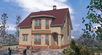 | Фасад | стены дома отделаны лицевым керамическим кирпичом цвета "солома". Элементы фасада (карнизы окон, элементы эркера, узоры) - из лицевого керамического кирпича цвета "шоколад". Цоколь из красного кирпича, рядового | |
