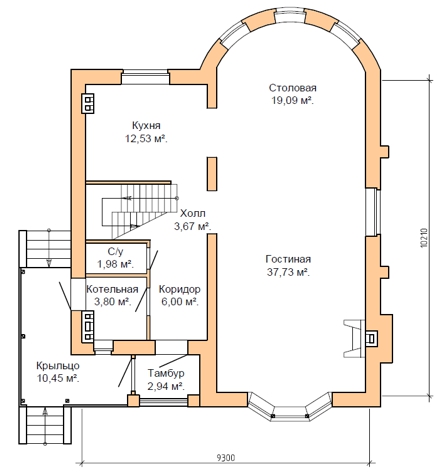 | 1 этаж | крыльцо, тамбур, коридор, котельная, с/у, лестничный холл, кухня, столовая, гостиная |
