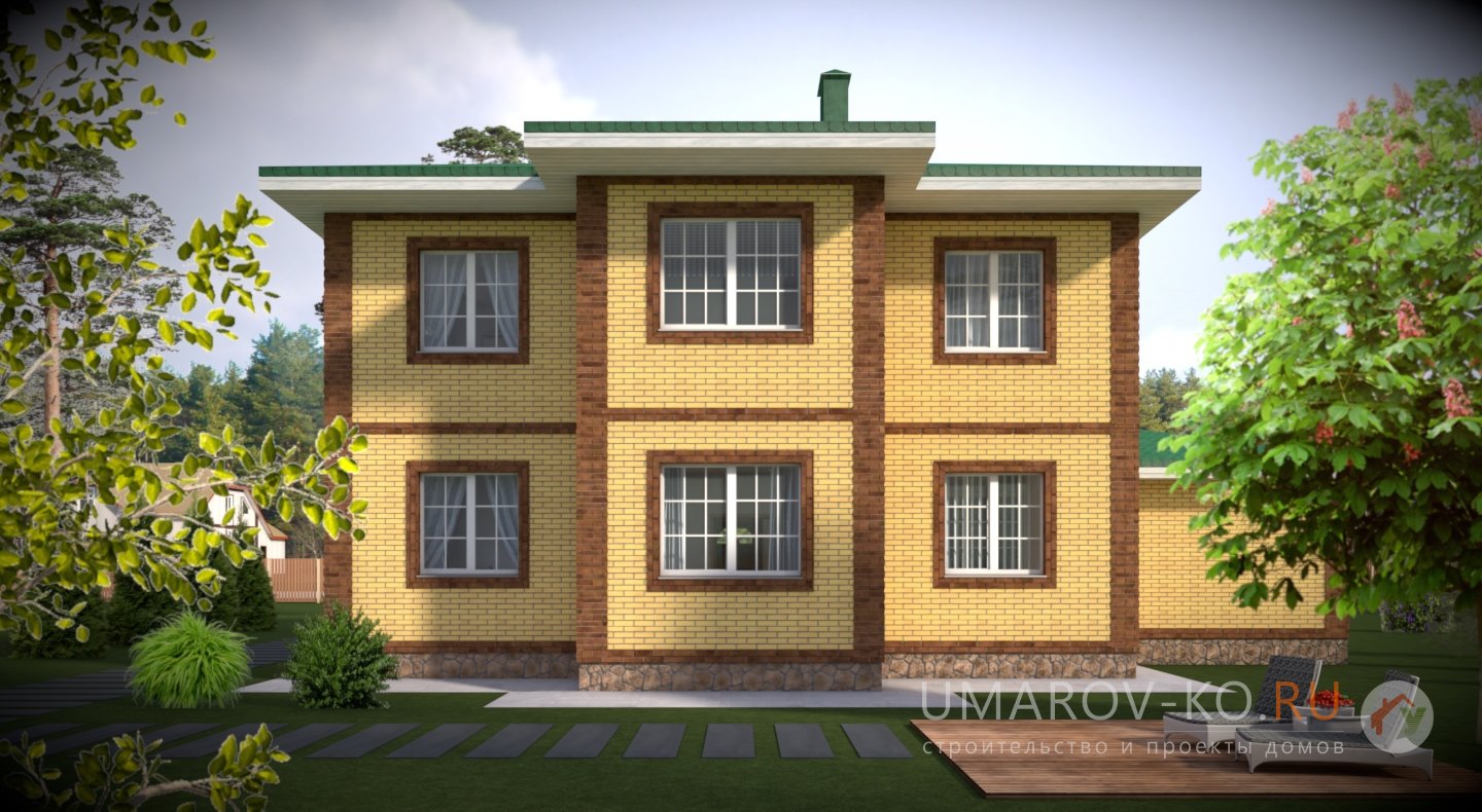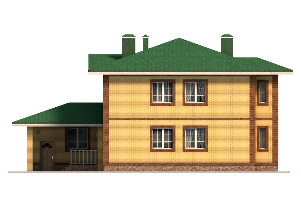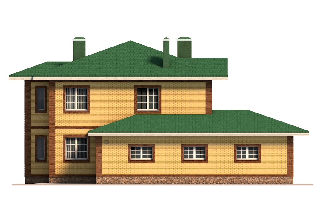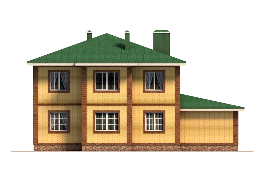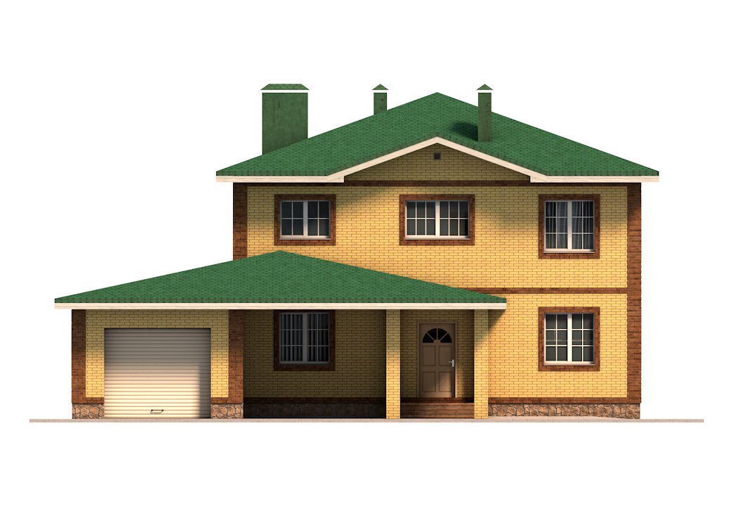 | Фасад | стены дома облицованы одинарным керамическим кирпичом цвета "Солома". Обрамления углов, оконных и дверных проёмов выполнены из керамического полуторного кирпича цвета "шоколад". Цоколь выполнен из рядового красного кирпича под отделку камнем. |