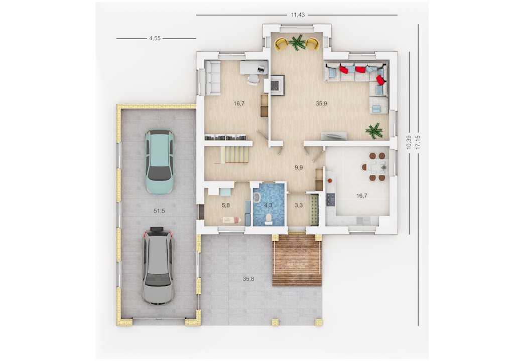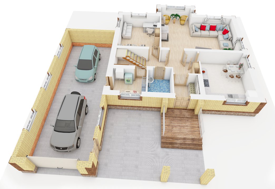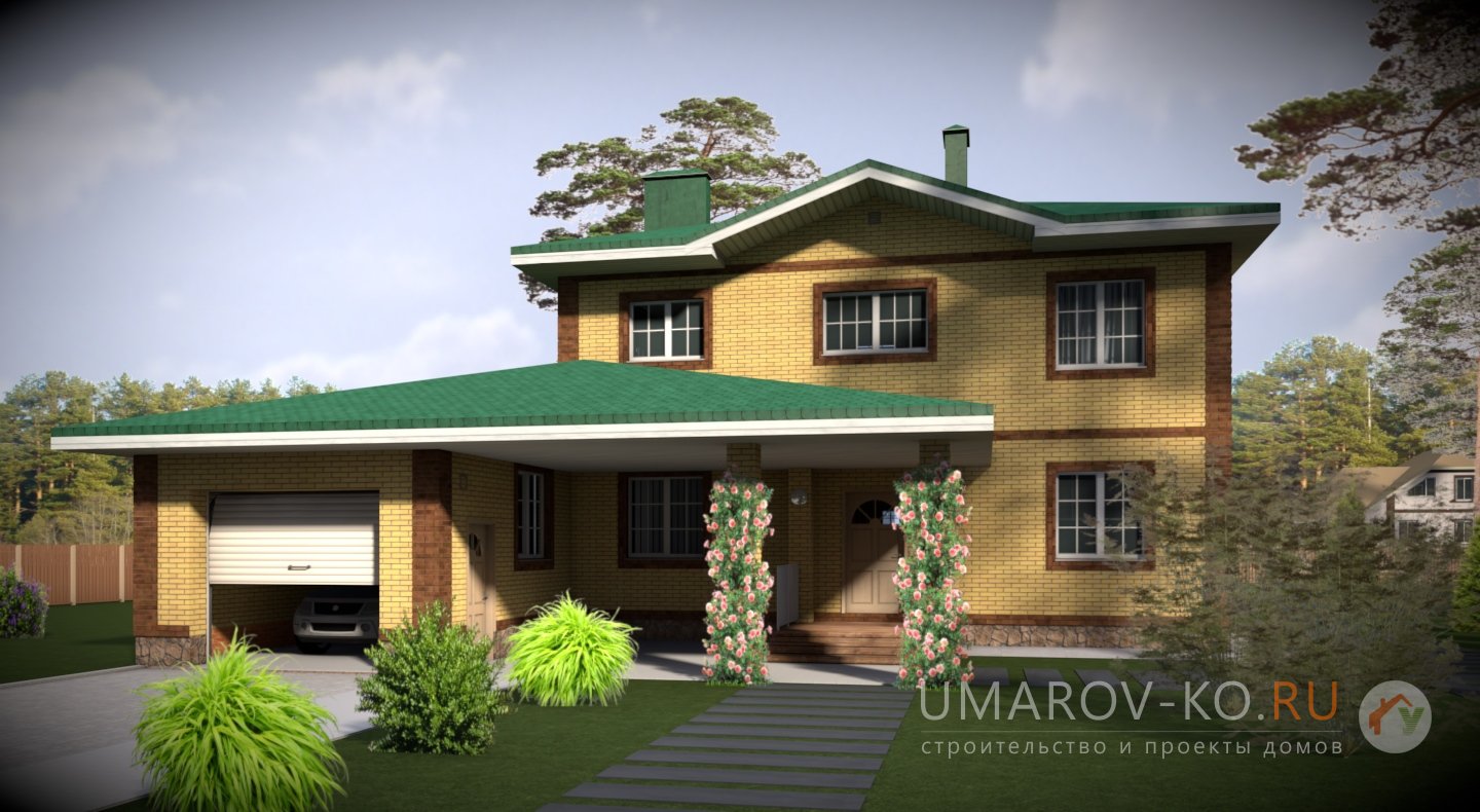 | 1 этаж | тамбур, коридор, котельная (сауна), с/у, кухня, гостиная, кабинет, гараж на 2 машины или на одну + холодное хозяйственное помещение (часто под таким гаражом делают овощную яму), навес, крыльцо |