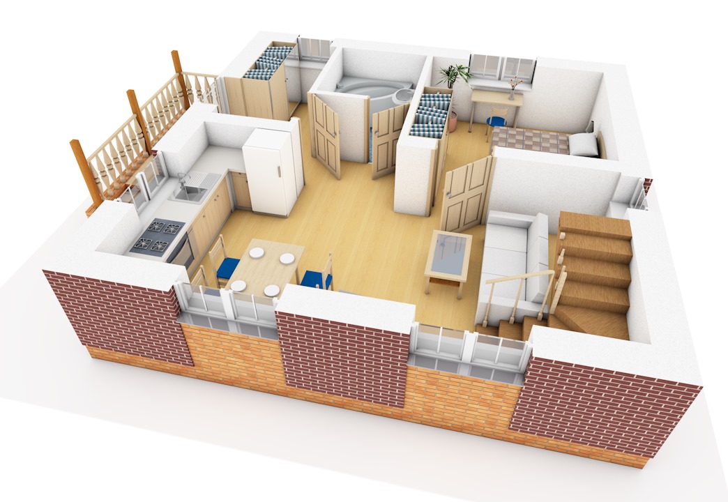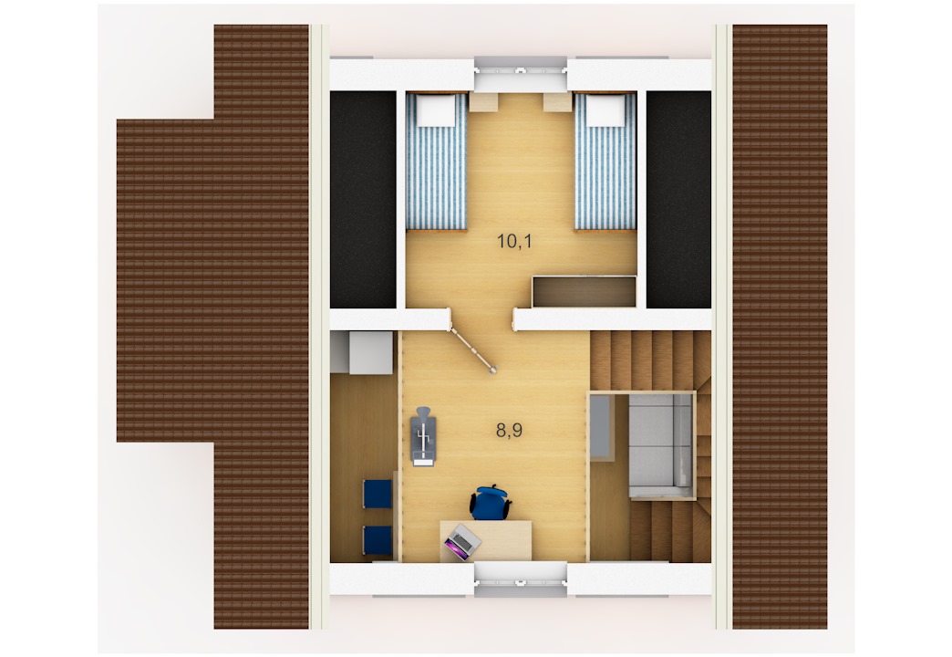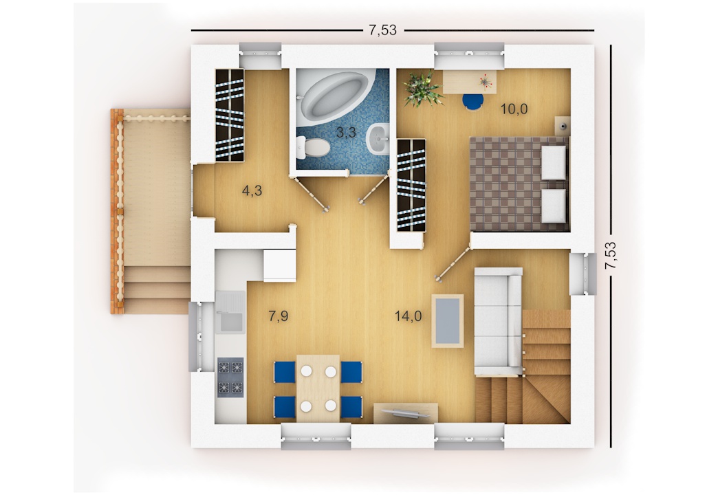 | 1 этаж | крыльцо, прихожая, холл, с/у - ванная, объединённое пространство: кухня-столовая и гостиная, спальня | |
