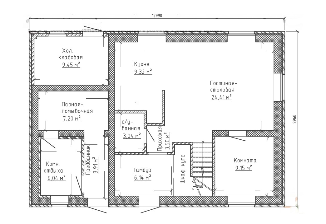 | 1 этаж | тамбур, ниша под шкаф-купе, прихожая, с/у-ванная, комната, гостиная-столовая, кухня, предбанник, комната отдыха, парная-помывочная, холодная кладовая |