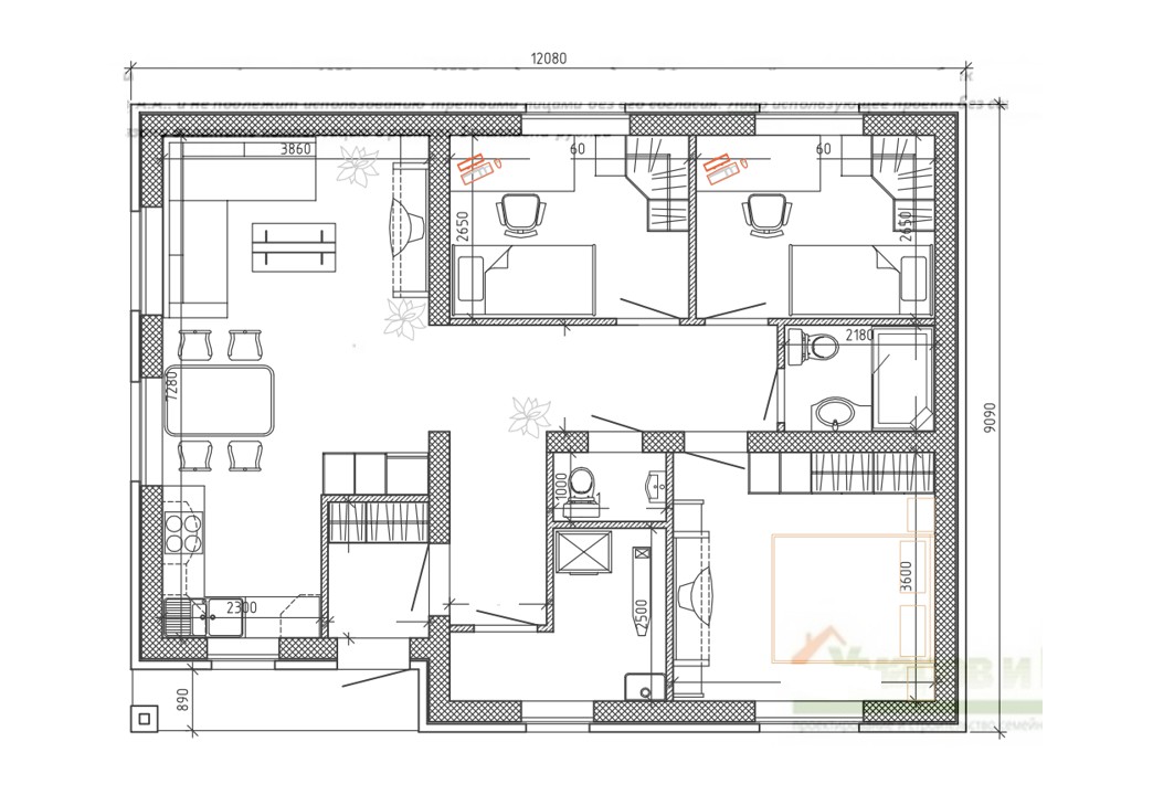«Эдуард» - удобный одноэтажный дом. Совмещенная гостиная и кухня-столовая 25 м², спальня хозяев и две небольшие изолированные комнаты, раздельные ванная и санузел, котельная-кладовая создают комфортное пространство для проживания семьи из 3-4 человек.