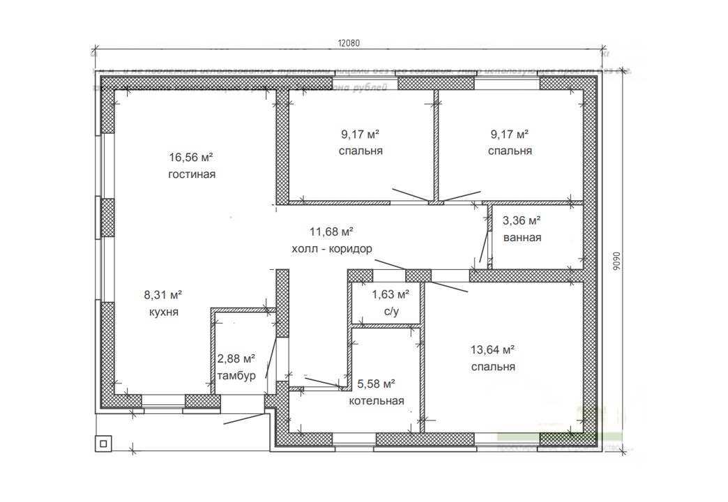 | 1 этаж | крыльцо, тамбур, холл-коридор, с/у, ванная, котельная-кладовая, гостиная-кухня-столовая, 3 спальни |