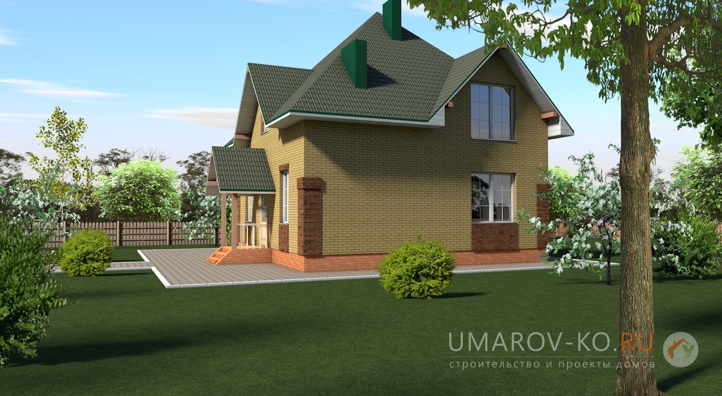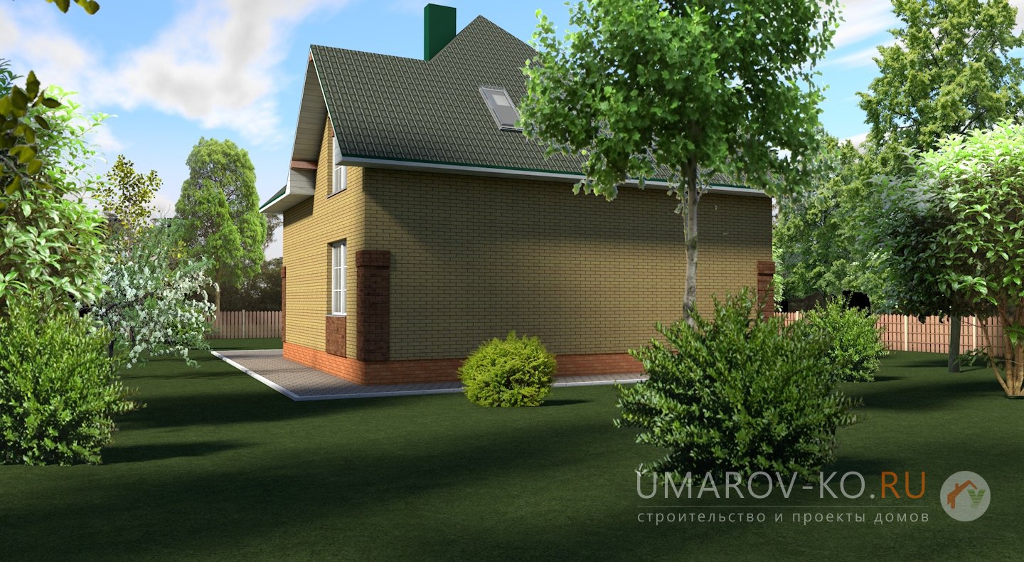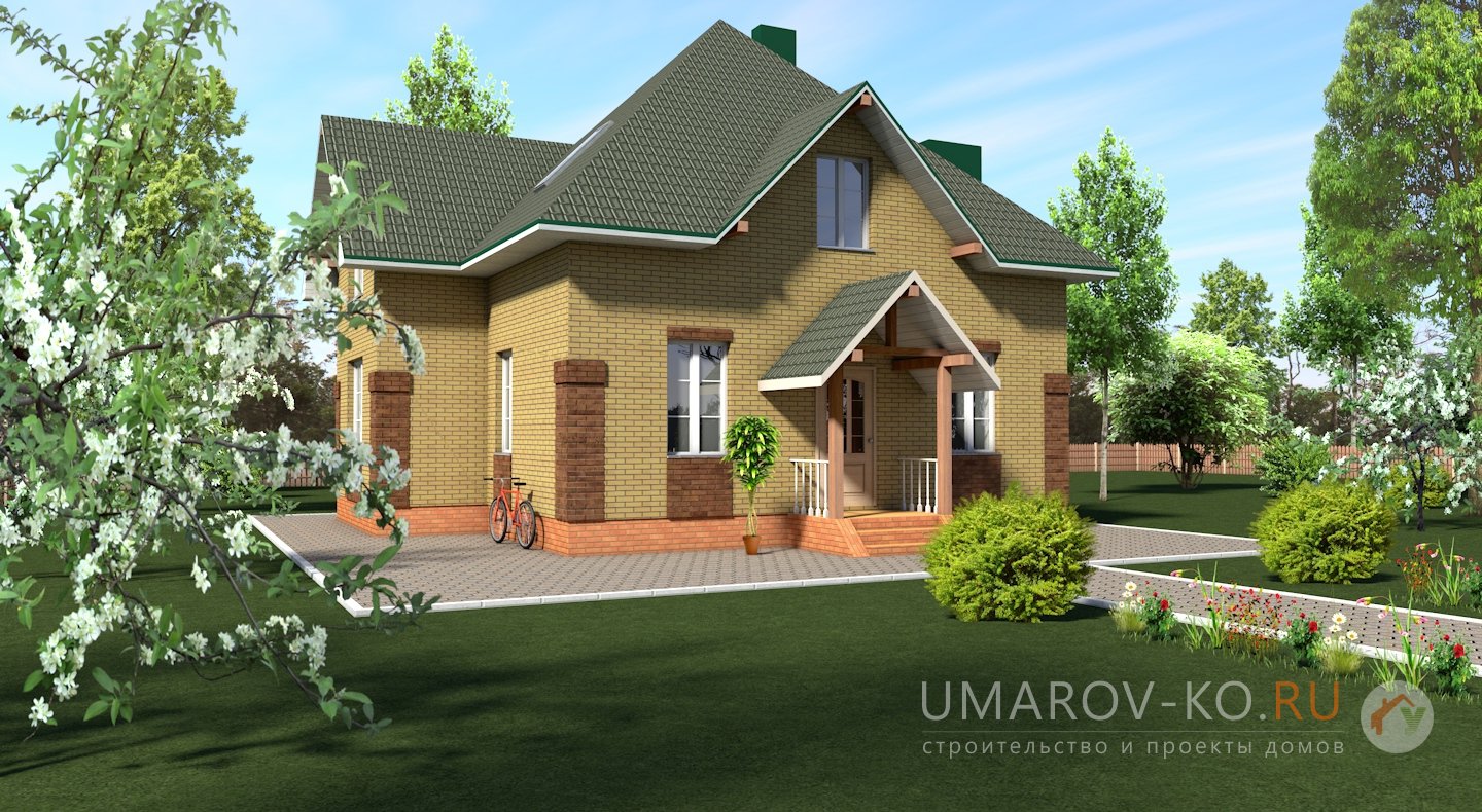 | Фасад | стены дома облицованы одинарным керамическим кирпичом желтого цвета. Обрамление углов дома до уровня второго этажа, карнизы оконных проемов, участки фасада под окнами первого этажа облицованы одинарным керамическим коричневым кирпичом. Цоколь из красного кирпича, рядового под отделку декоративным камнем. Крыльцо оформлено деревянными стойками. Каменные трубы обшиты металлическими листами под цвет кровли. Мансардные окна - по месту. |