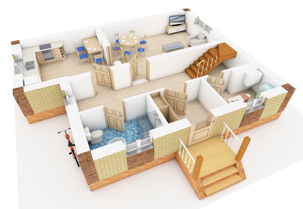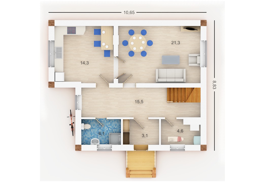 | 1 этаж | тамбур, котельная (кладовая), с/у+ванная, прихожая, гардероб, кухня, гостиная |