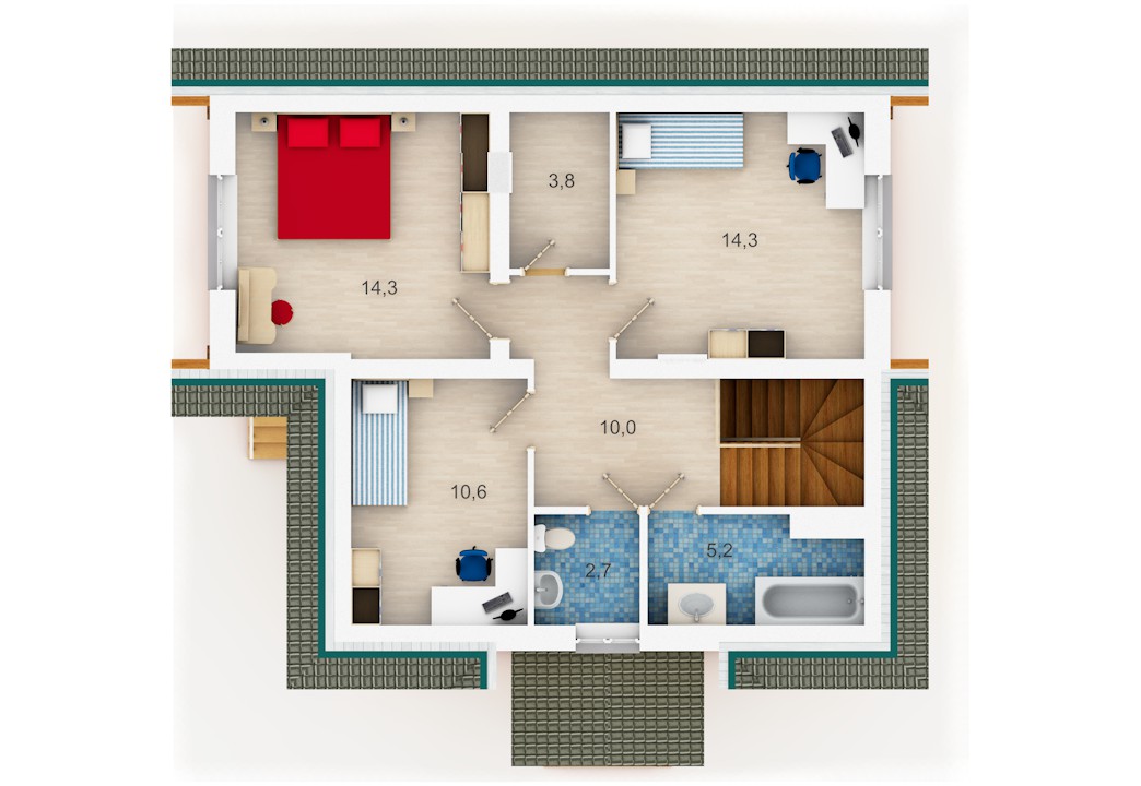 | 2 этаж | холл с коридором, с/у, ванная, 3 спальни, гардероб |