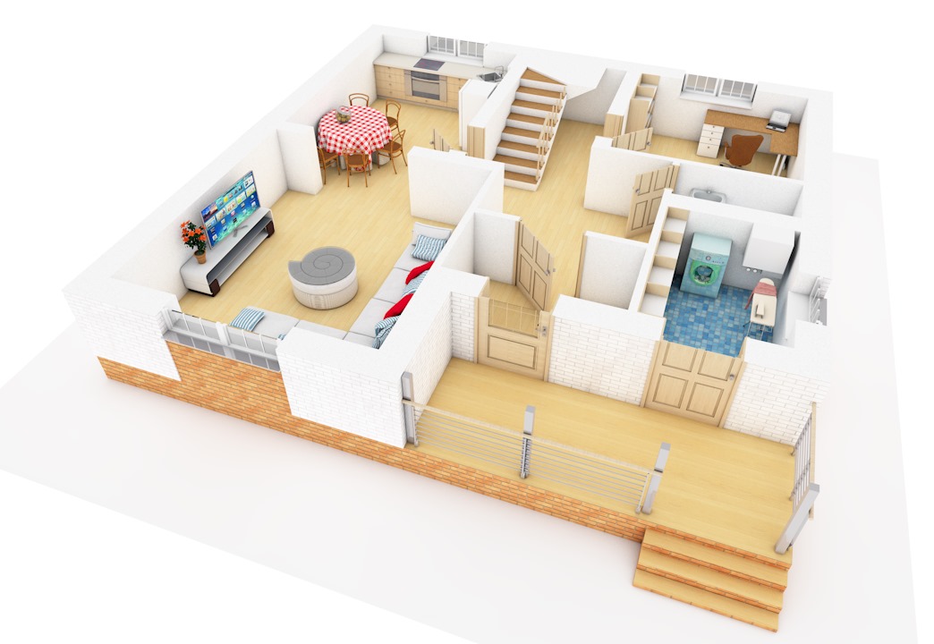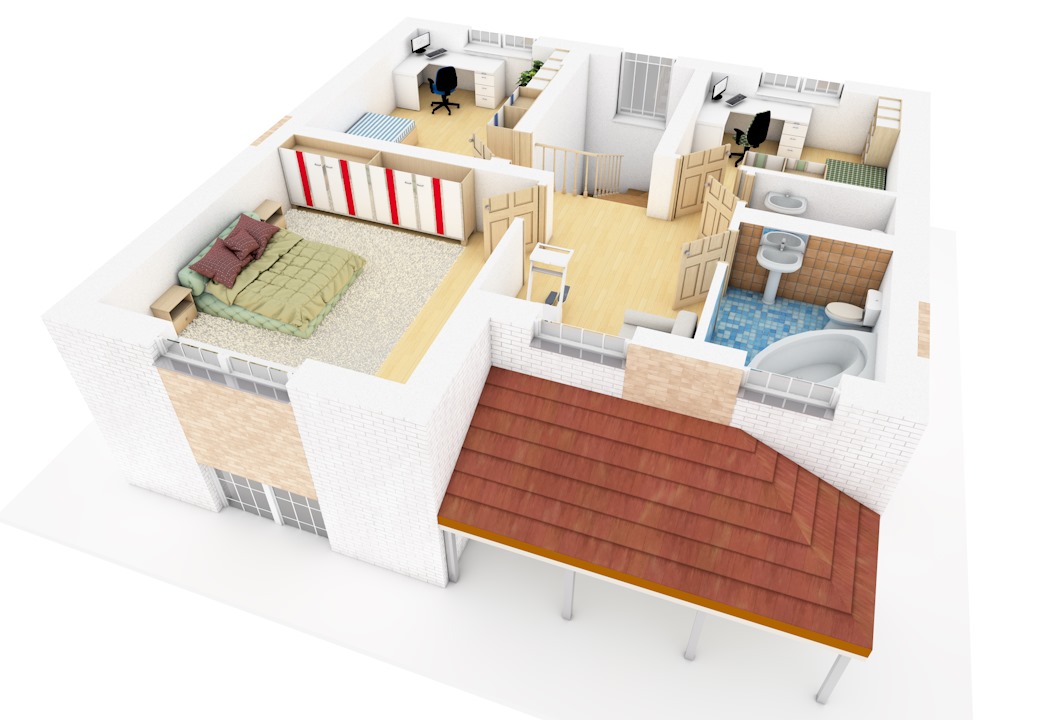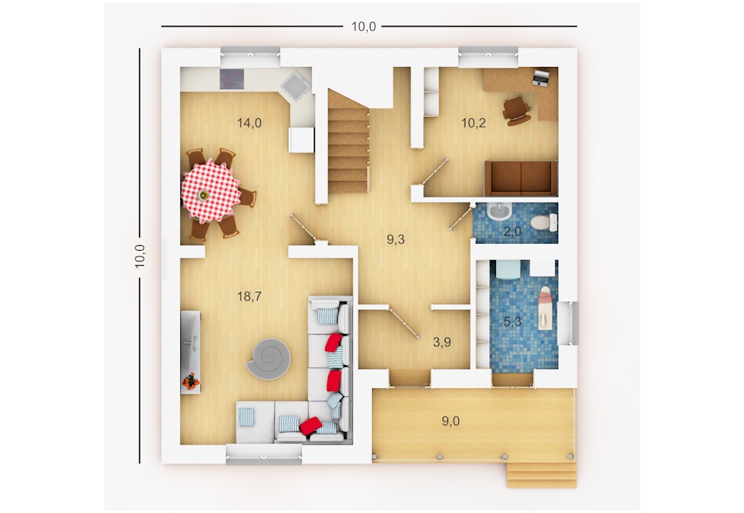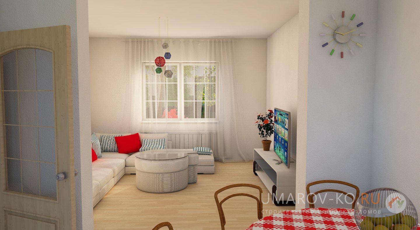 | 1 этаж | крыльцо, тамбур, холл, гостиная-кухня, кабинет, с/у, котельная (сауна или кладовая, если предусмотреть дверь) |