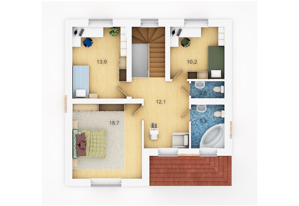 | 2 этаж | холл, с/у, 3 спальни, ванная |