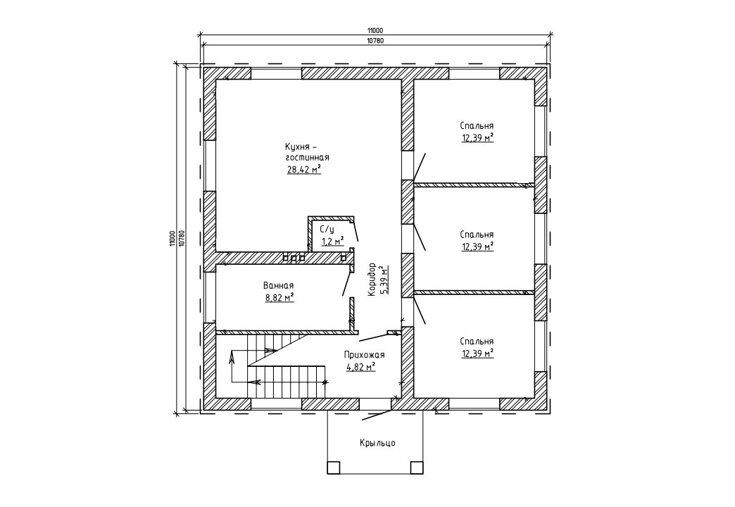 | 1 этаж | прихожая, коридор, с/у, ванная, кухня-гостиная, 3 спальни |