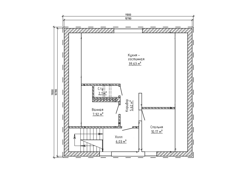 | 2 этаж | холл, коридор, спальня, кухня-гостиная, ванная, с/у |