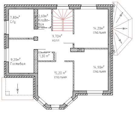 | 2 этаж | холл, с/у, гардеробная (кладовая), гостевая, спальня с эркером, 2 спальни |