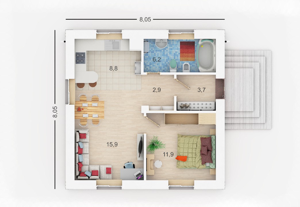 Семейный дом «Корка» - выгодный в строительстве и эксплуатации маленький одноэтажный дом оснащен всем необходимым для круглогодичного проживания. Комфорт в использовании помещений на одном уровне исключает необходимость перехода с этажа на этаж. Отсутствие несущих стен даёт возможность свободно менять планировку. Открытая кухня зрительно увеличивает пространство дневной зоны.