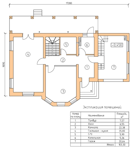 | 1 этаж | тамбур, холл, комната, кухня-гостиная, с/у, котельная, гараж, терраса |