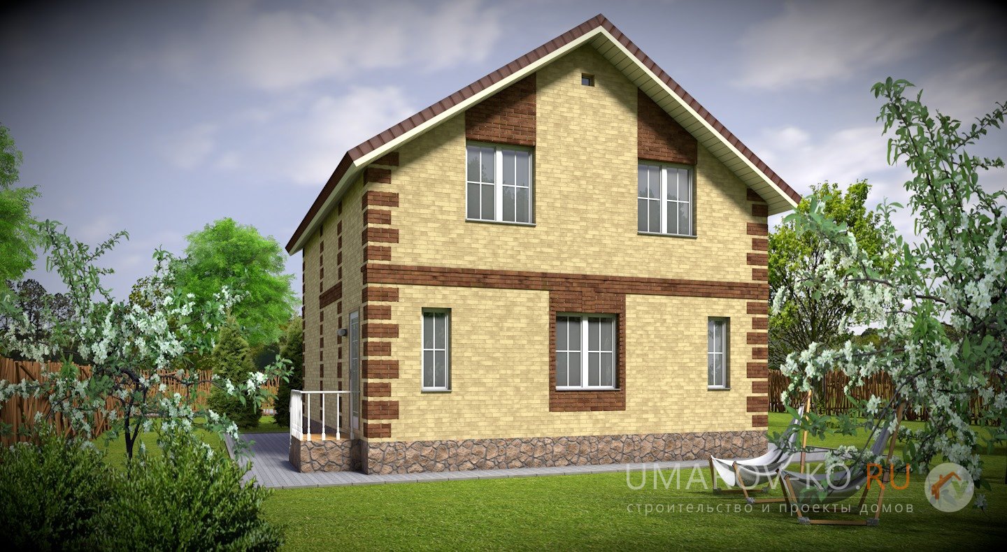| Фасады | стены дома отделаны облицовочным одинарным кирпичом цвета "Солома". Обрамления углов, оконных и дверных проемов выполнены из облицовочного одинарного кирпича цвета "Шоколад". Цоколь выполнен из красного рядового кирпича под отделку камнем. Ограждение балкона - деревянное |