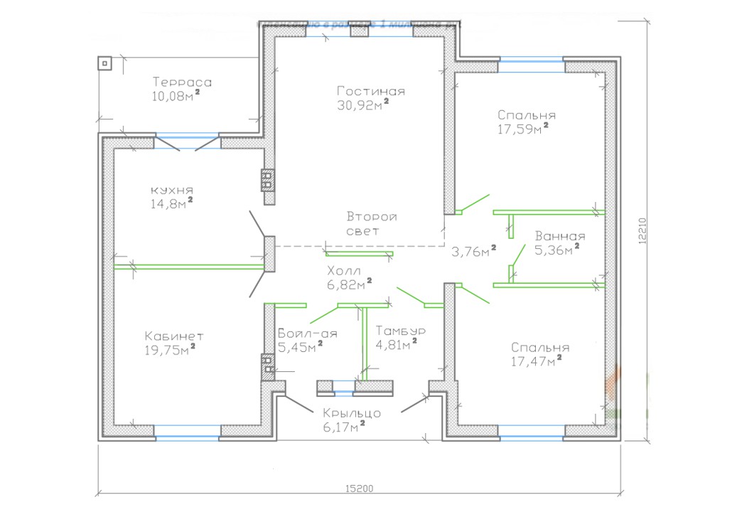 | 1 этаж | крыльцо, тамбур, холл, бойлерная, ванная, кухня, гостиная, 2 спальни, кабинет |