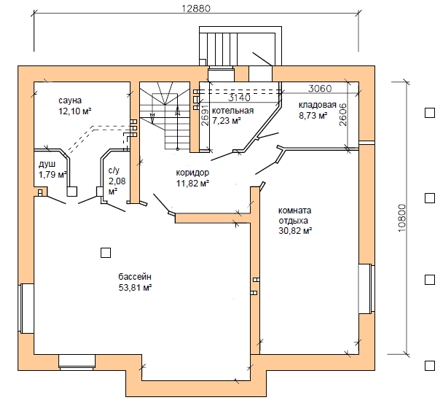 | Цокольный этаж | коридор, котельная, кладовая, комната отдыха, сауна, душ, с/у, бассейн | |
