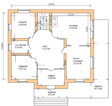 | 1 этаж | терраса, прихожая, холл, гардероб, с/у + ванная, кухня-столовая, гостиная, спальня | |