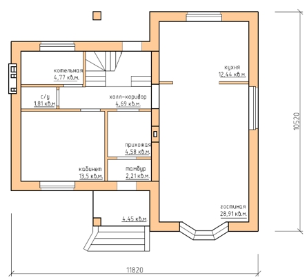 | 1 этаж | тамбур, прихожая, холл-коридор, с/у, котельная, кабинет, кухня, гостиная |