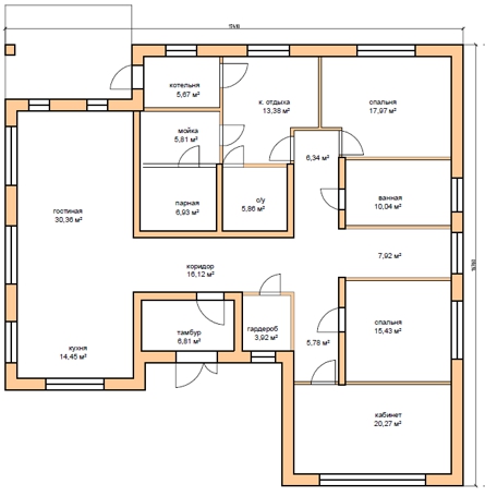 | 1 этаж | тамбур, коридор, гардероб, гостиная, кухня, кабинет, 2 спальни, ванная, с/у, комната отдыха, котельная, мойка, парная |