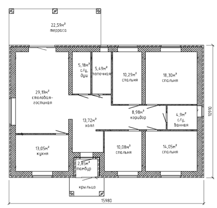 | 1 этаж | крыльцо, тамбур, топочная (или сауна), душ, ванная, с/у, холл, коридор, кухня, столовая-гостиная, 4 спальни, терраса |