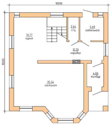 | 1 этаж | тамбур, коридор-прихожая, котельная (или сауна; или ванная), с/у, кухня, гостиная |