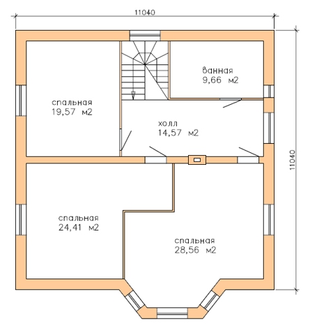 По статистике - самый востребованный проект! Нами построено в различных вариациях около трёх десятков домов по Удмуртии и Республике Татарстан. Презентабельный внешний вид, при сравнительно небольшом усложнении конструкции дома, удобная и рациональная внутренняя планировка позволяют использовать этот дом для постоянного проживания семьи из 4-6 человек. В проекте сразу заложен дымоход под камин. Часто дома по этому проекты строят на продажу. Проект, по сути, является увеличенным (с габаритов 10*10 до 11*11 метров) проектом "Пионер-2".