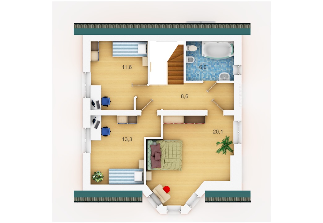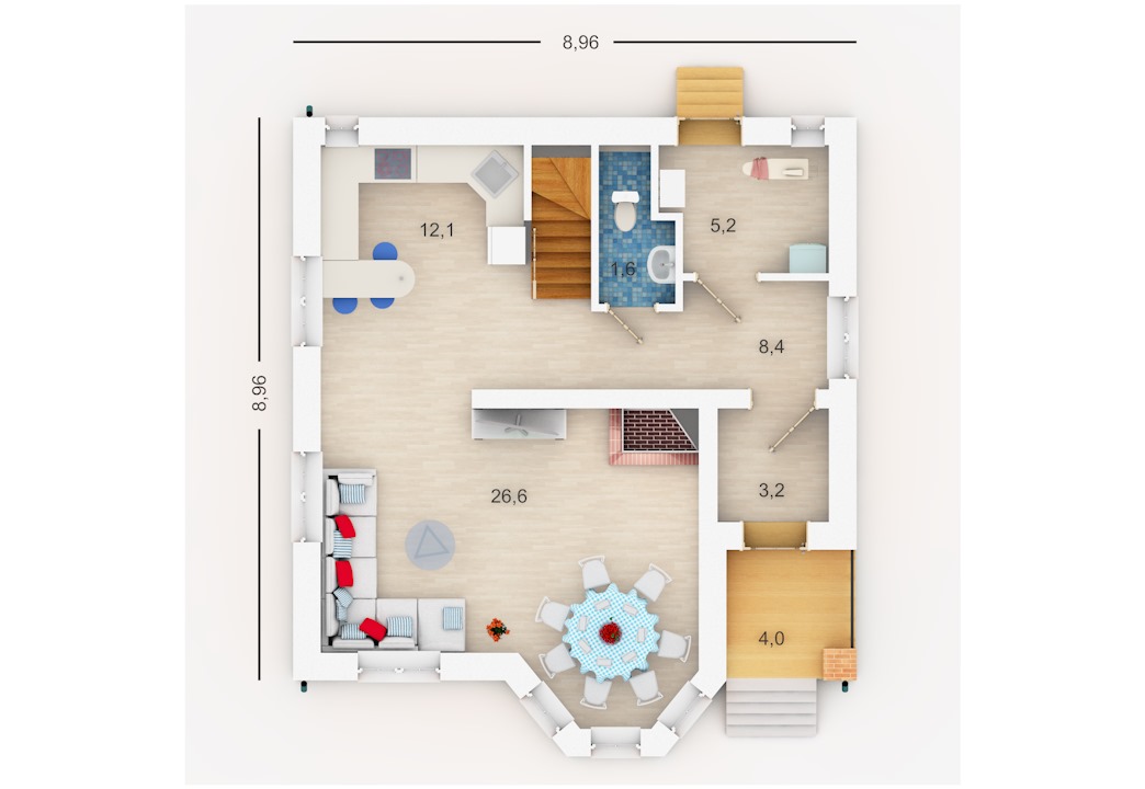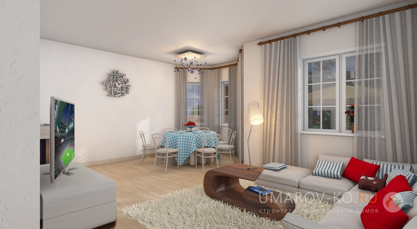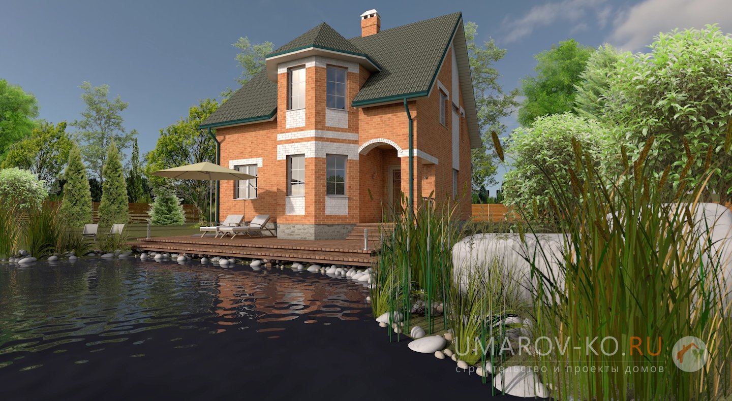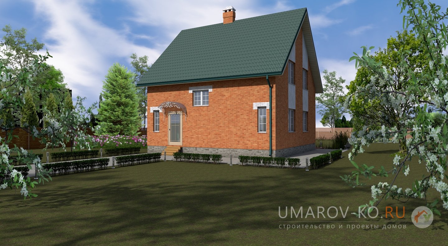 По статистике - самый востребованный проект! Нами построено в различных вариациях около трёх десятков домов по Удмуртии и Республике Татарстан. Презентабельный внешний вид при сравнительно небольшом усложнении конструкции дома, удобная и рациональная внутренняя планировка позволяют использовать этот дом для постоянного проживания семьи из 3-5 человек. В проекте сразу заложен дымоход под камин. Часто дома по этому проекты строят на продажу. Есть вариант проекта, где эркер, расширяющий одну из спален, заменён балконом ("Пионер с балконом"). Имеется увеличенный по габаритам (с 9*9 до 10*10 метров) проект "Пионер-2", и далее (до 11*11 метров) проект "Пионер-3".