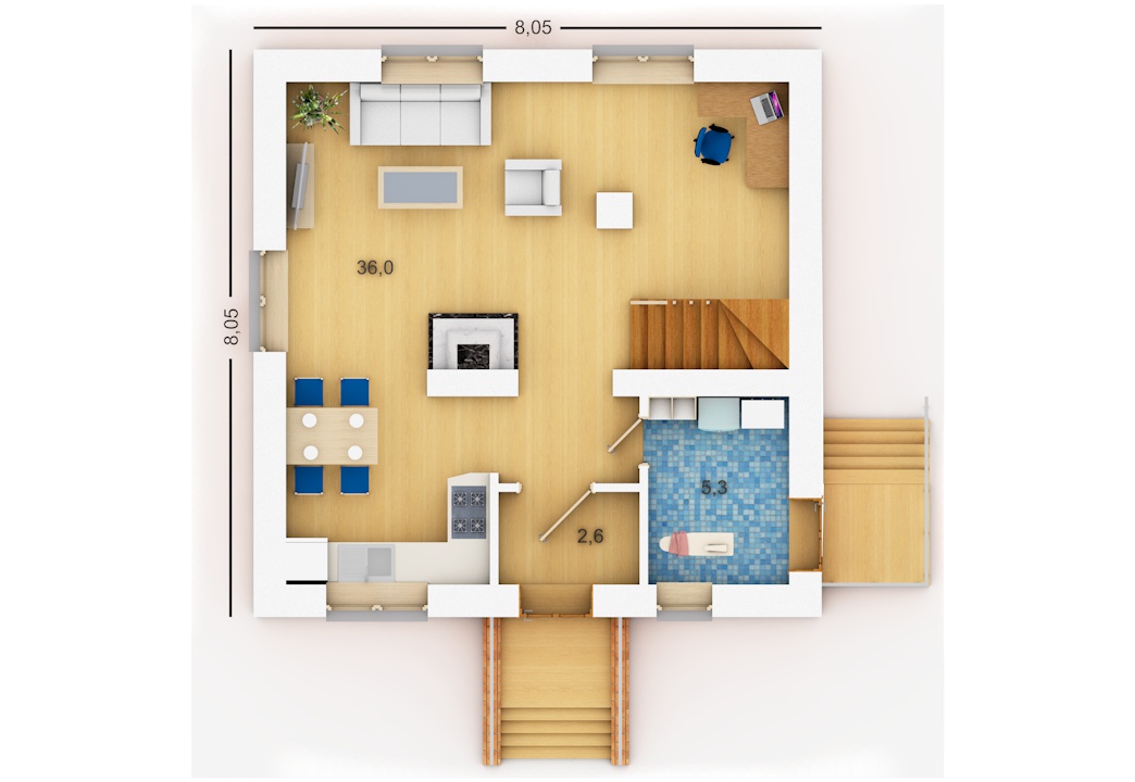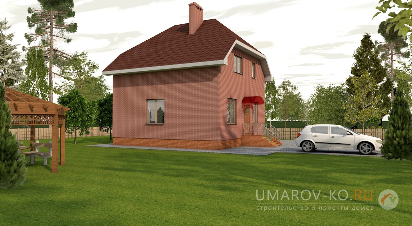 Проект небольшого дома для постоянного проживания либо основательного дома для садового участка. В проекте сразу заложен дымоход под камин.