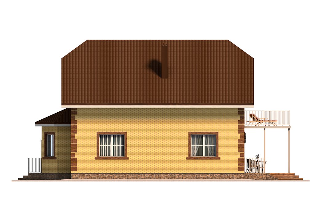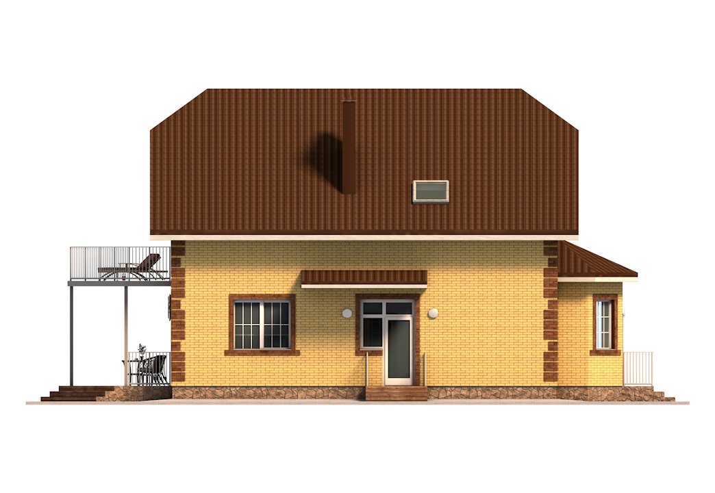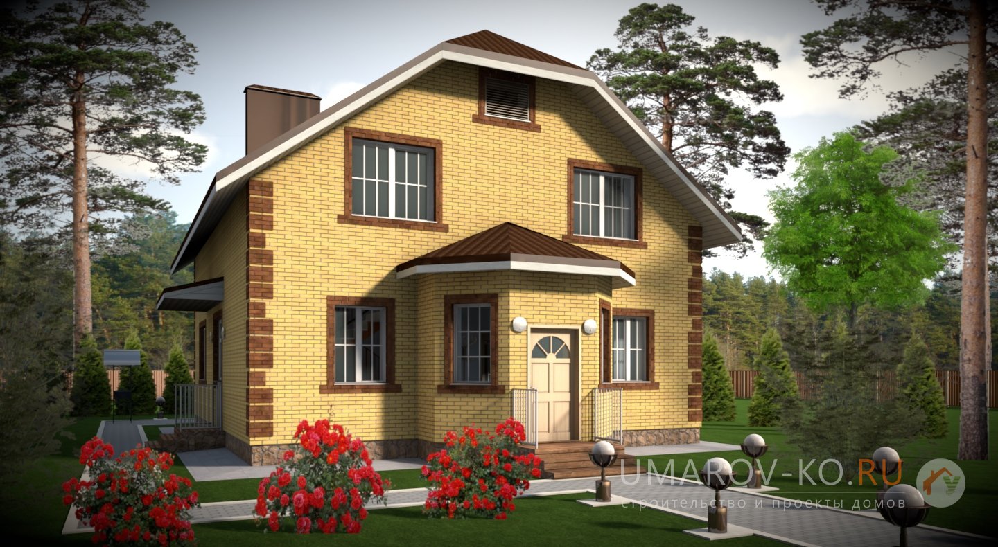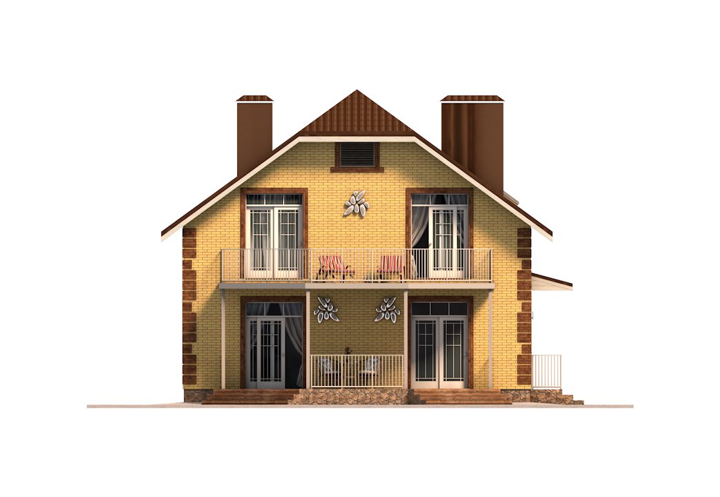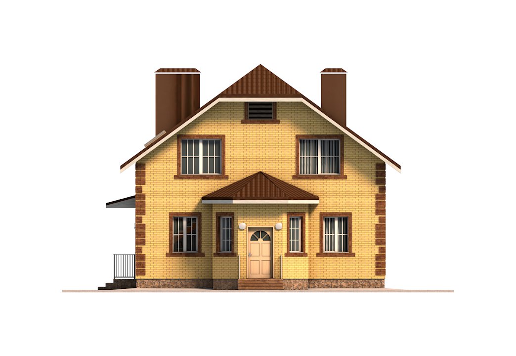 | Фасад | стены дома облицованы одинарным керамическим кирпичом цвета "солома". Обрамления оконных проёмов и узоры на углах и фасадах дома выполнены из керамического одинарного кирпича цвета "шоколад". Узоры создаются выпуском облицовочного кирпича на 10-15 мм. Цоколь выполнен из рядового красного кирпича под отделку камнем | |