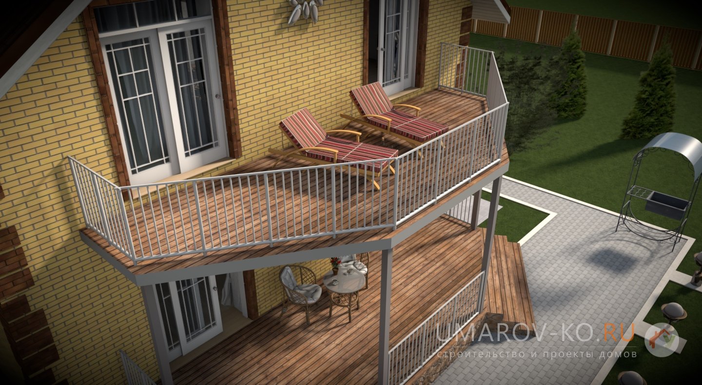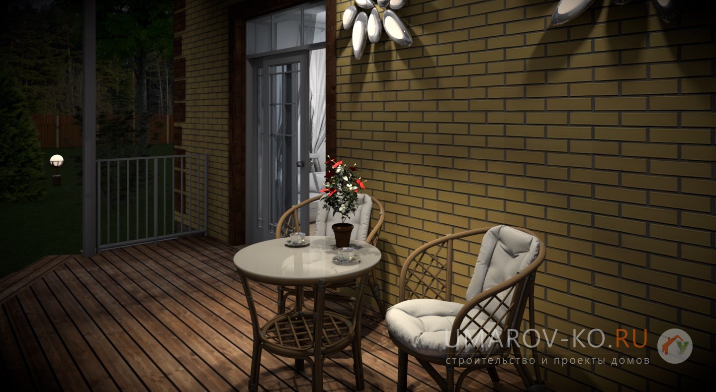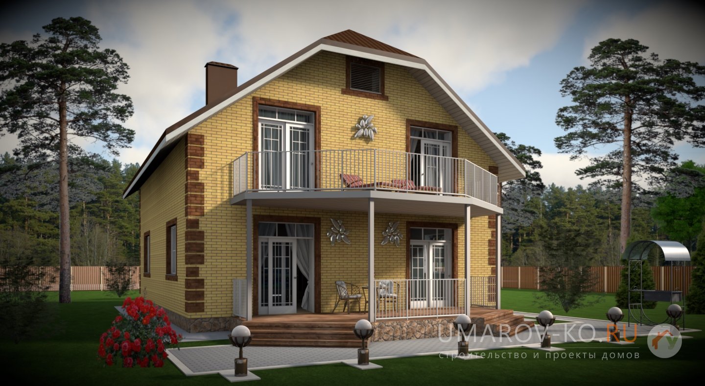 | Фасад | стены дома облицованы одинарным керамическим кирпичом цвета "солома". Обрамления оконных проёмов и узоры на углах и фасадах дома выполнены из керамического одинарного кирпича цвета "шоколад". Узоры создаются выпуском облицовочного кирпича на 10-15 мм. Цоколь выполнен из рядового красного кирпича под отделку камнем | |