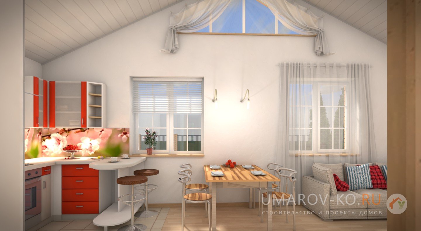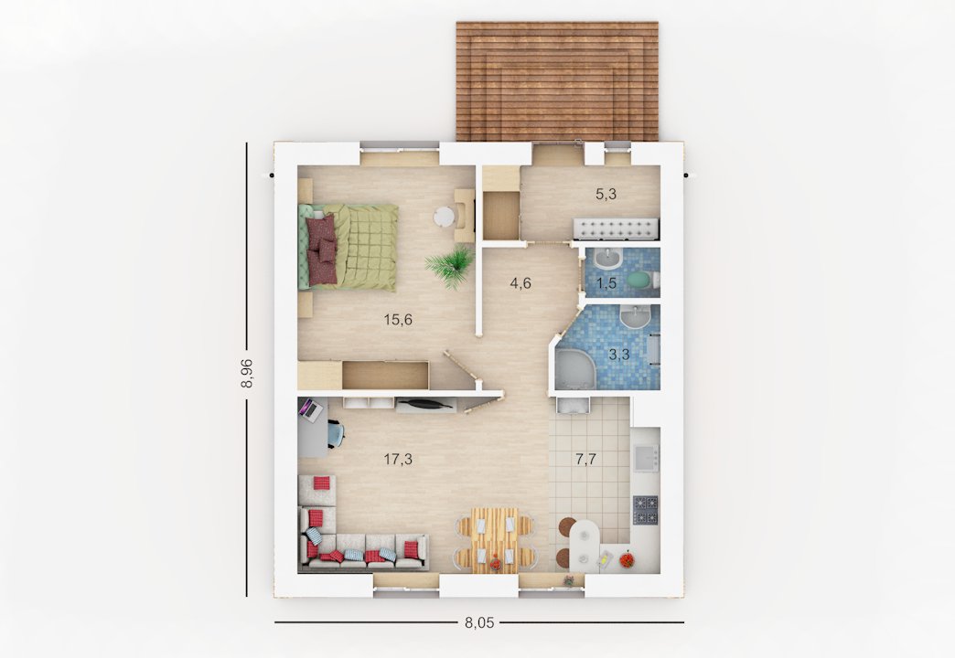 «Смайл-1» - это проект маленького уютного дома с функциональной планировкой. Неповторимое очарование придаёт дому второй свет - все помещения наполнены воздухом и простором! Несмотря на маленькую площадь, дом оснащен всем необходимым для постоянного проживания. Простая форма дома и его небольшая площадь способствуют экономичному ведению строительства и невысоким эксплуатационным расходам - этакая раскошная двухкомнатная квартира.