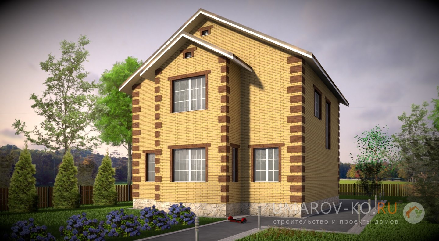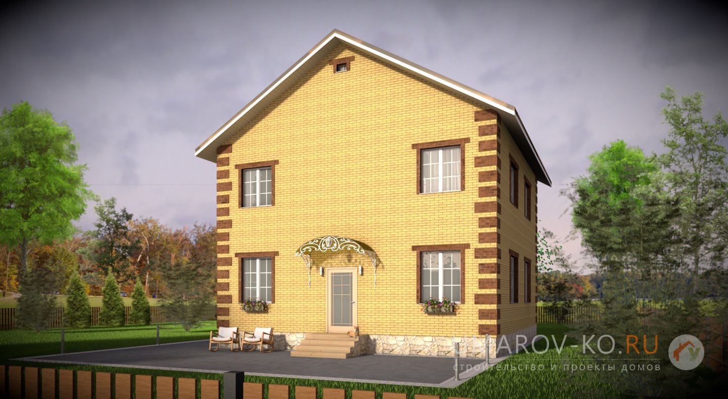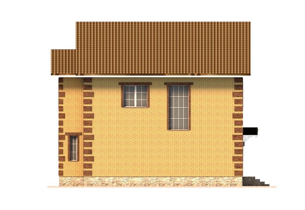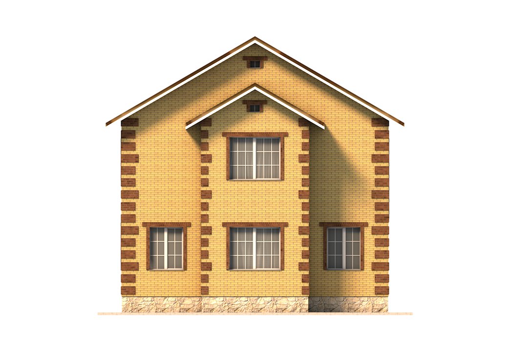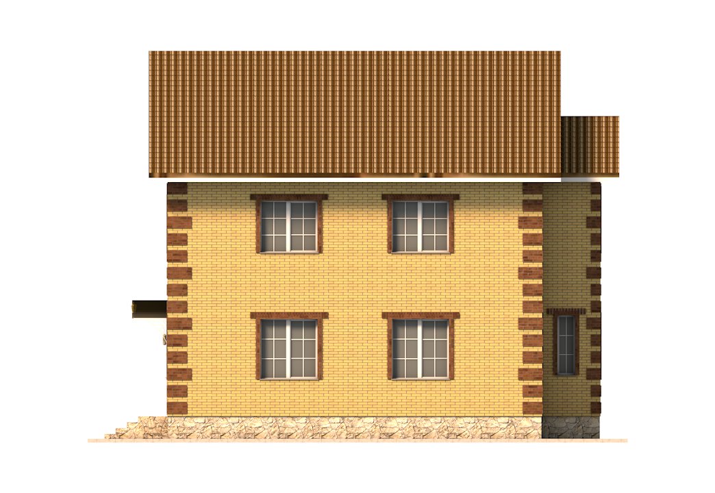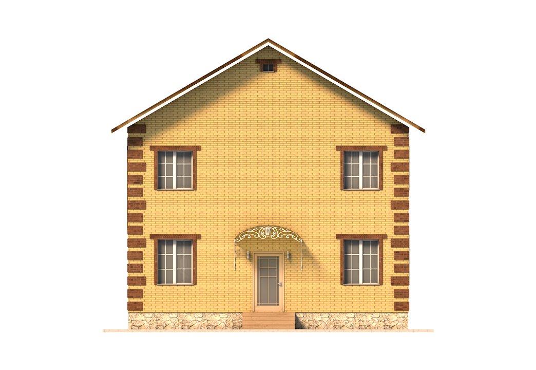| Фасад | стены дома отделаны облицовочным одинарным керамическим кирпичом цвета "солома", углы и обрамеления - цветом "шоколад". Цоколь выполнен из рядового красного кирпича под отделку камнем |