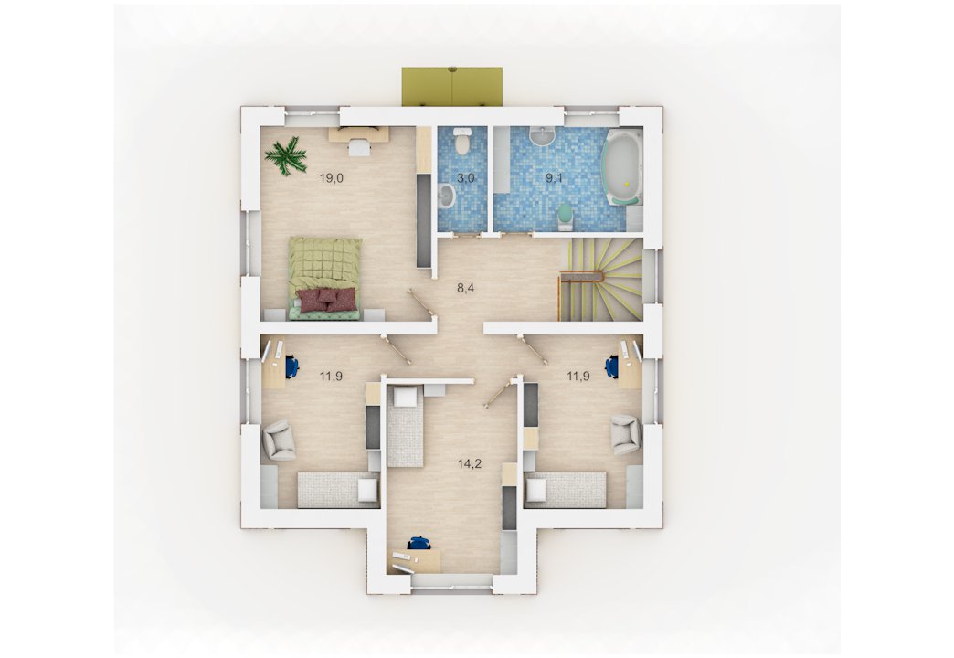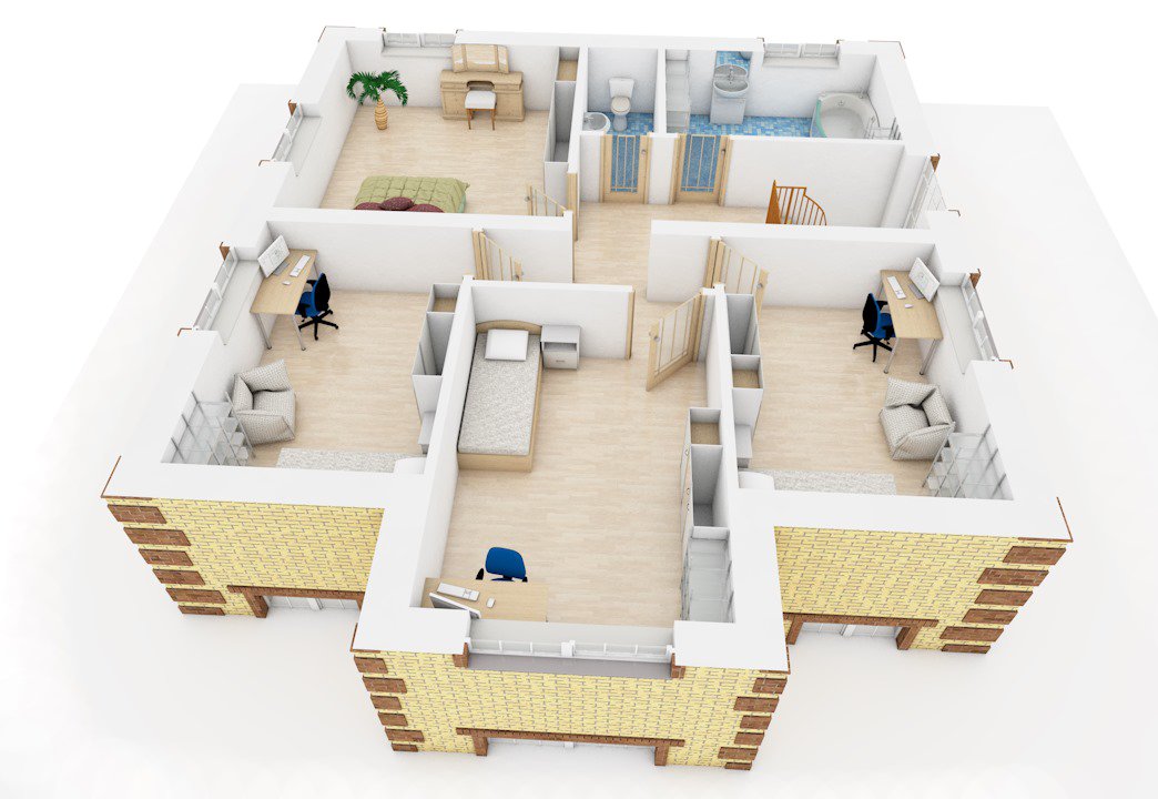 | 2 этаж | холл, с/у, ванная, 4 спальни |