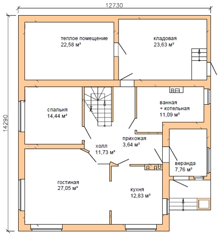 | 1 этаж | веранда, прихожая, холл, ванная + котельная (сауна), кухня, гостиная, спальня, кладовая, теплое помещение; подвал: 5 помещений | |