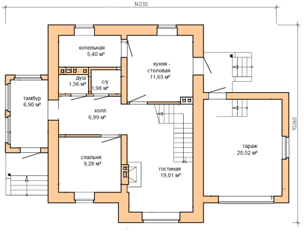 | 1 этаж | тамбур, холл, с/у, душ, котельная, кухня-столовая, гостиная, спальня, гараж |