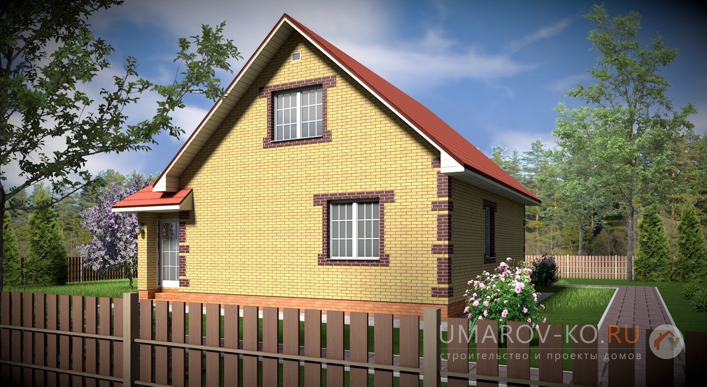 | Фасад | стены дома облицованы одинарным керамическим кирпичом желтого цвета (солома). Обрамление оконных проемов и узоры на углах дома выполнены облицовочным одинарным керамическим кирпичом коричневого цвета (шоколад). Цоколь выполнен из рядового красного кирпича. Каменные трубы обшиты листами металла под цвет кровли |