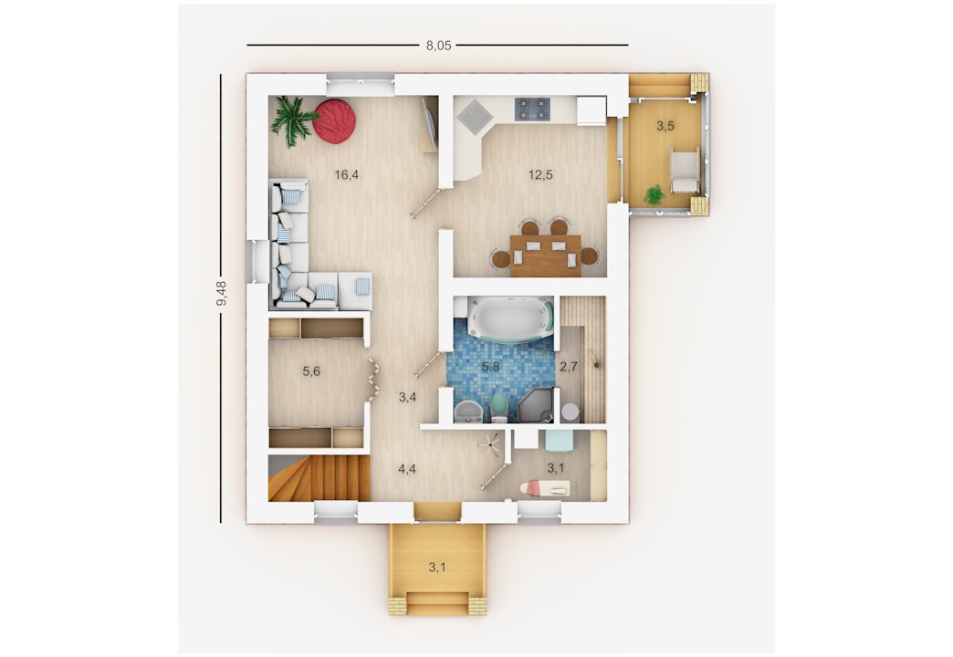 «Вика» - очень популярный проект небольшого удобного дома. Помимо раздельных гостиной и кухни с верандой и выходом в сад на первом этаже расположены большая ванная комната с сауной, отдельная гардеробная комната и техническое помещение, где помимо инженерного оборудования можно разместить стиральную машину, гладильную доску и систему хранения домашних заготовок. Второй этаж имеет свой санузел, большую спальню хозяев дома и дополнительную комнату или кабинет.