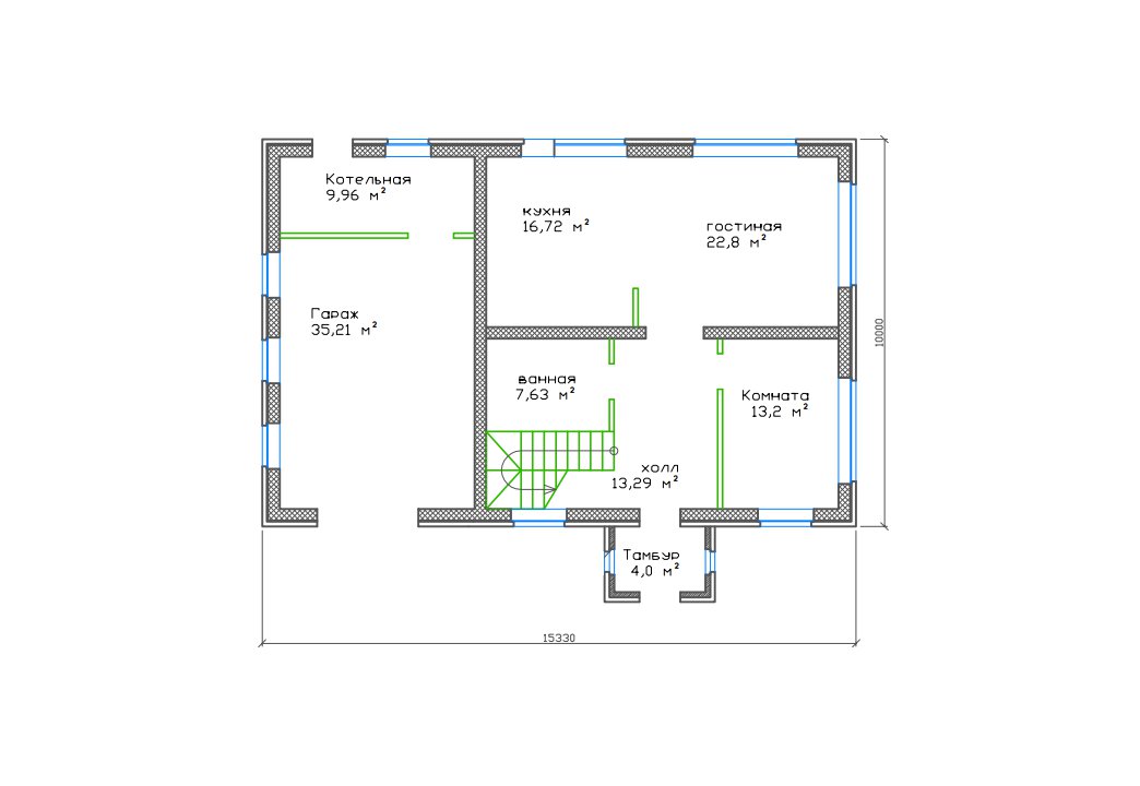 | 1 этаж | тамбур, холл, котельная, ванная, кухня, гостиная, комната, гараж |