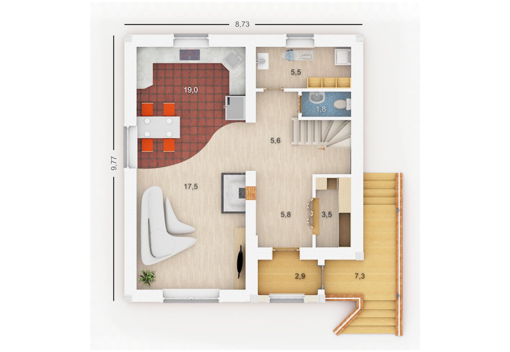 | 1 этаж | крыльцо, тамбур, прихожая, гардеробная, лестничный холл, с/у, тех. помещение, кухня-столовая, гостиная | |