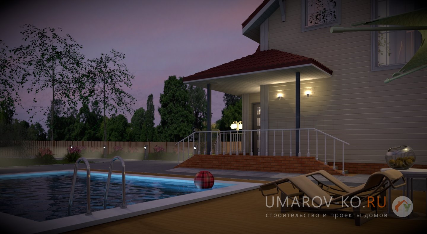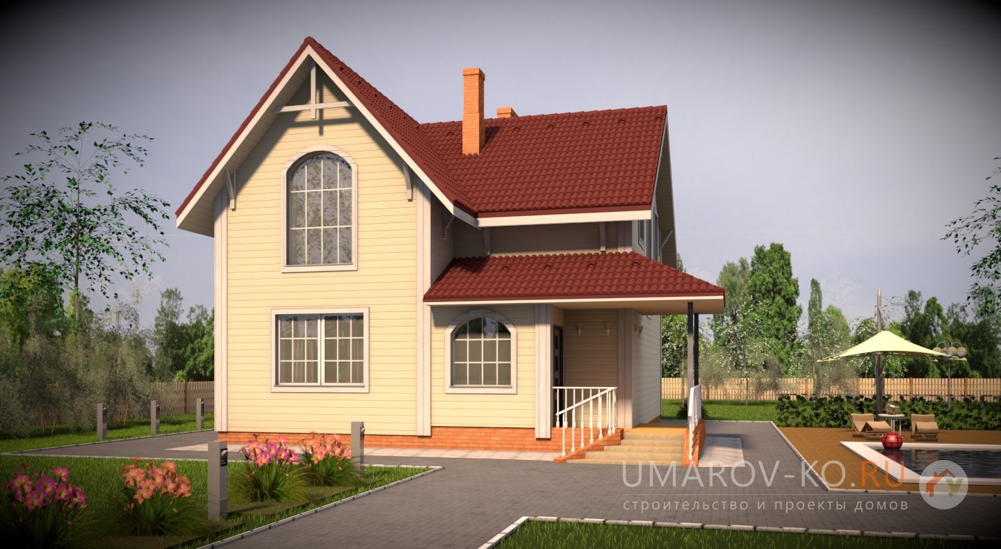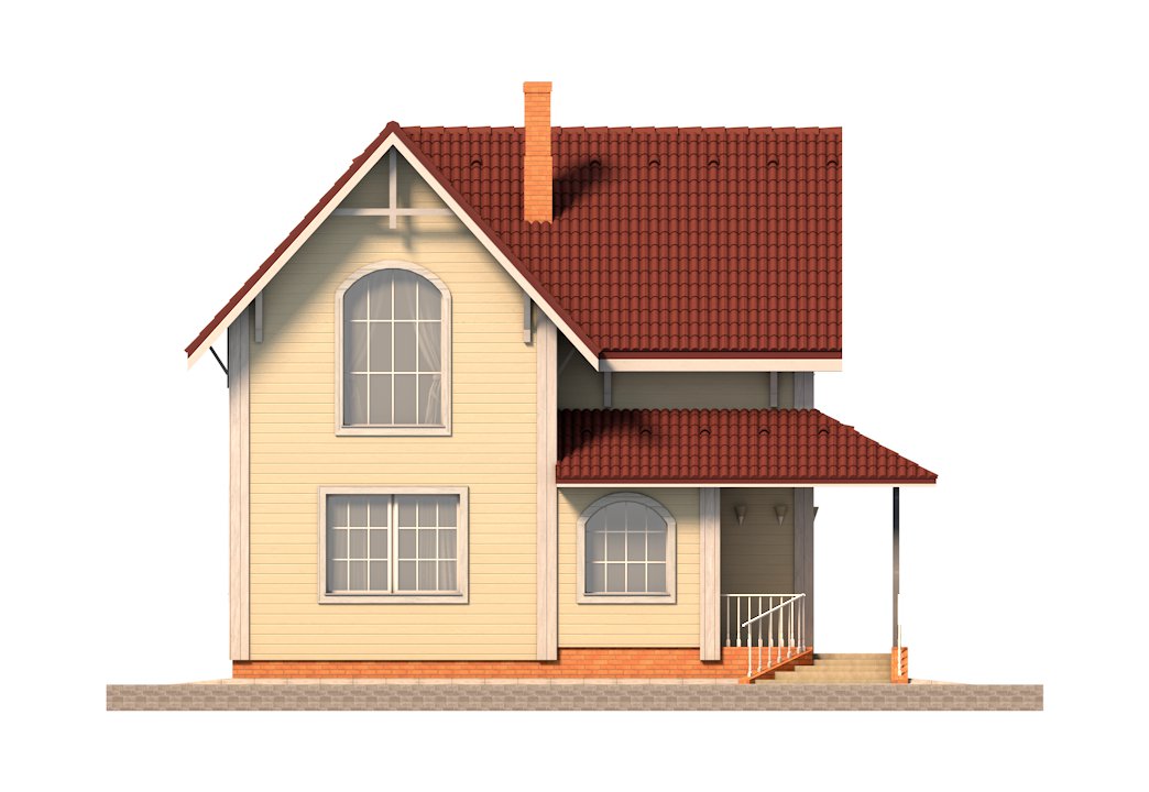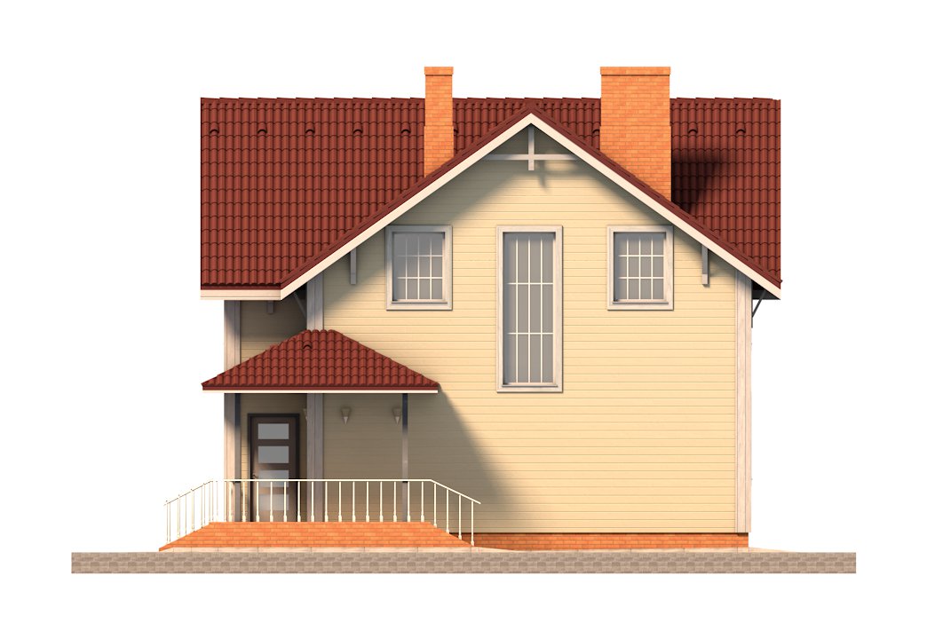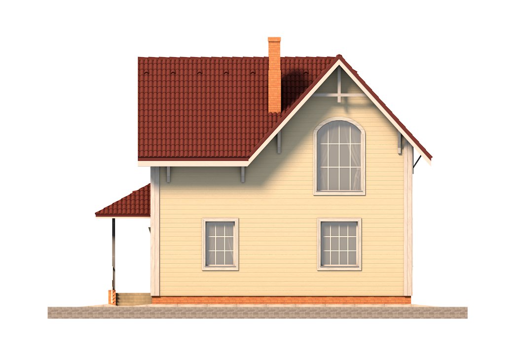 | Фасад | стены дома облицованы одинарным керамическим кирпичом желтого цвета (солома). Обрамление оконных проемов и узоры на углах дома выполнены облицовочным одинарным керамическим кирпичом коричневого цвета (шоколад). Цоколь выполнен из рядового красного кирпича. Каменные трубы обшиты листами металла под цвет кровли | |